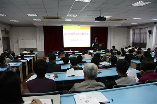 接着,周树红老师对2013年毕业生就业工作作了总结,他指出,只有出口“畅”,才能入口“旺”,2013年就业工作继续深化“大就业”理念,构建校院两级管理长效机制,打造“就业满意工程”,提升就业质量,各院系逐步形成就业特色,并且积极与政府、企业、用人单位、校友等联系,拓展资源,建立实习就业基地,同时,继续开展毕业生调查等工作,同时,他提出,2014年就业工作将继续加强与名企事业单位的合作,全方位推进开放办学,加强考研出国引导服务,充分利用校友资源,建立健全校友数据库,继续完善职业发展与就业指导体系等,构建开放的就业工作体系。