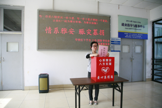据了解,除了募捐活动以外,我校团委、学生会、青年志愿者协会、爱心社等组织还开展了防震抗震知识讲座、爱心祈福活动和爱心义卖等活动,为雅安震区同胞祈福、献爱心,理工校园里一时间成为了爱的海洋。