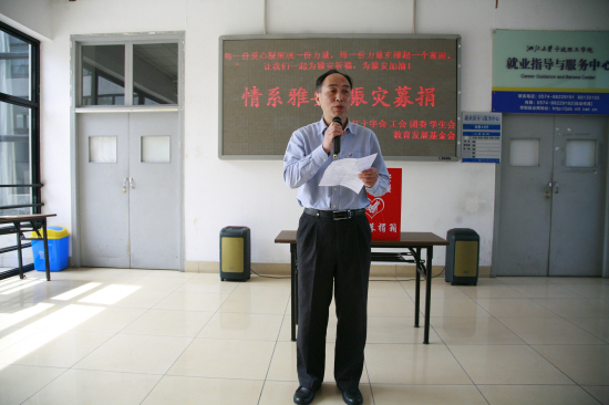 募捐仪式上,学校党委书记费英勤发表讲话。他说,地震发生后,我校各级组织及时发出赈灾号召,第一时间对来自地震灾区及四川籍的师生表达了关心和问候,让他们充分感受到理工大家庭的关心和温暖。一方有难,八方支援,捐款的同时,我校师生通过邮寄帐篷、睡袋、生活用品等各种形式向灾区人民表达了爱心。这些筹集起来的物资和善款虽然只是微薄之力,但师生们用一颗颗爱心向灾区人民传递了正能量,表达了理工人与雅安人民风雨同舟、心手相连、共渡难关、重建家园的心愿。据统计,截止4月20日14:00,本次募捐活动共筹集师生方面善款12万元,部分师生捐款仍在继续中。