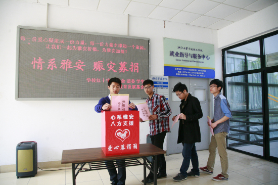 爱心募捐活动得到了全体师生的积极响应。4月28日上午,学校在教学区NB大厅举行了“心系雅安,奉献爱心”赈灾募捐仪式,仪式由校团委书记、校红十字副会长应中元老师主持,学校领导、各分工会老师代表、各院系学生代表参加了现场募捐活动。