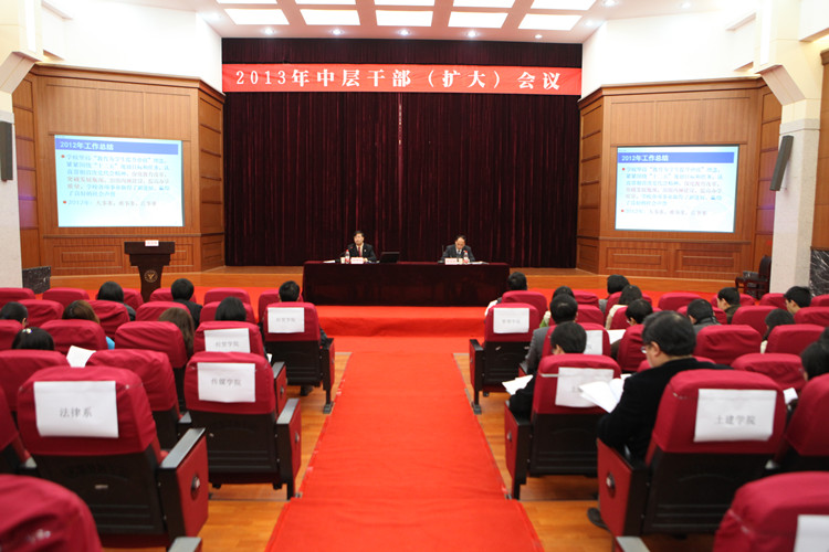 3月15日下午,学校在金宗城法学中心召开2013年中层干部(扩大)会议。学校领导班子成员出席会议。学校院长金伟良在会上作了讲话。会议由党委书记费英勤主持。