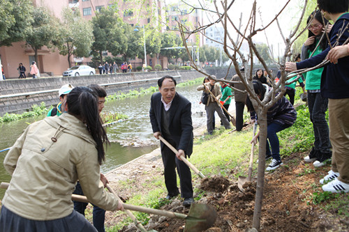 在活动现场,师生们一道挥锹铲土,浇水灌溉,用行动传递绿色,用汗水将近50株早樱树植于理工河畔。通过大家的悉心呵护,期盼在不久的将来形成一片落樱缤纷的河岸美景。