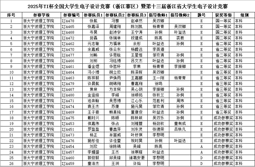 近日,2025年“TI杯”全国大学生电子设计竞赛总测评圆满落幕。在本届赛事中,浙大宁波理工学院实现历史性突破,共派出32支队伍参赛,经过“4天3夜”的奋力拼搏,荣获全国一等奖2项、全国二等奖2项、省二等奖5项、省三等奖8项以及成功参赛奖9项。