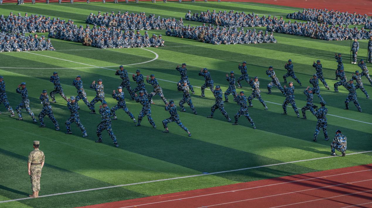 随后,分列式音乐响起,学员们踏着整齐的步伐,依次经过主席台,展示14天以来的军训成果。各方阵整齐划一,步伐铿锵,撼动大地;口号声震天动地,气冲霄汉,迸发出豪情万丈。团体操、擒敌拳、战术表演等科目表演将现场氛围推向高潮,紧张刺激,震撼人心。学员们精湛的技艺和过硬的本领,赢得了现场雷鸣般的掌声。