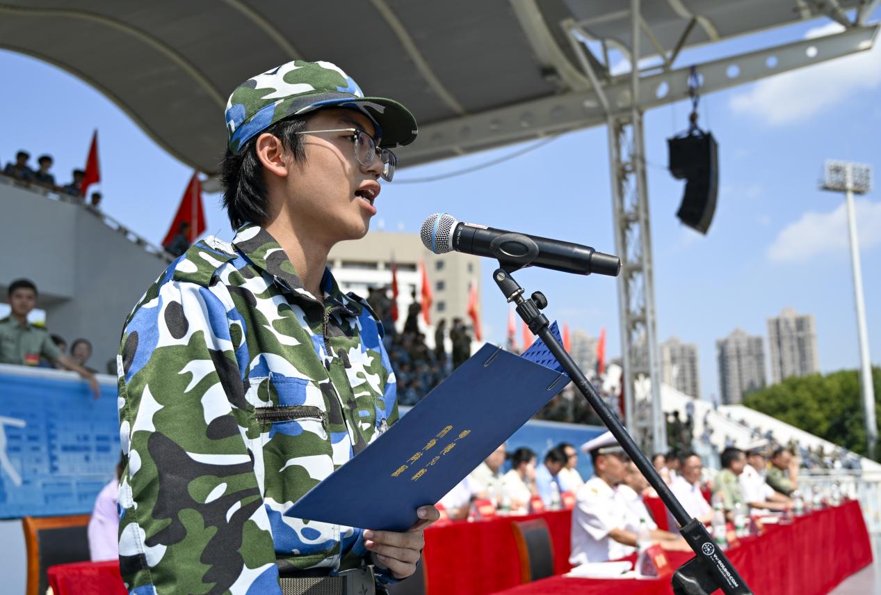 参训学员陈逸轩在发言中分享了自己的军训感悟。他以“迷彩征程的青春誓言与家国担当”为核心,深情回顾军训历程,深刻诠释青春使命,并承诺将把军训中所锤炼出的坚韧意志、责任意识与集体精神融入今后的学习与成长中,续写迷彩青春!