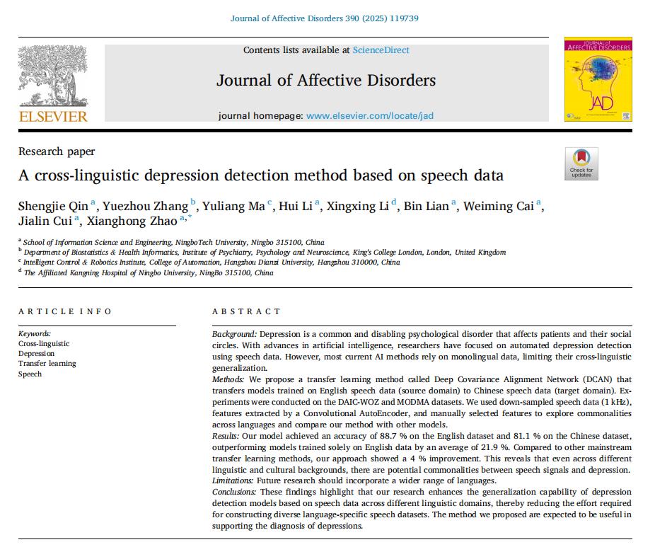 近日,我校信息学院自动化专业2024届毕业生、杭州电子科技大学研究生秦圣杰作为第一作者,我校信息学院赵祥红副教授作为唯一通信作者的研究论文《A cross-linguistic depression detection method based on speech data》,在精神病学领域国际权威期刊《Journal of Affective Disorders》上发表。该期刊位列JCR精神病学类33/288(Q1区)、中科院医学类Top期刊,最新影响因子4.9,代表领域前沿水平。
