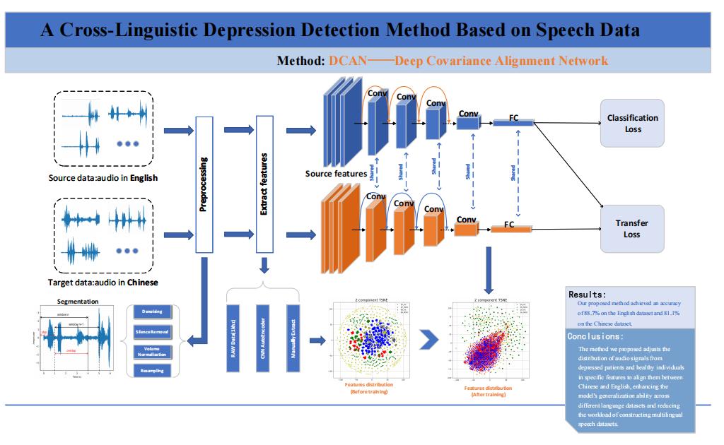 该研究还联合学校心理咨询中心、伦敦国王学院、杭州电子科技大学、宁波大学附属康宁医院等跨领域力量,解决了当前AI抑郁检测“依赖单语言数据、泛化能力弱”的痛点,提出的“深度协方差对齐网络(DCAN)”,在英语、汉语数据集上准确率分别达 88.7%、81.1%,较主流方法平均提升4%,显著增强了跨语言抑郁检测的可行性,为智能诊疗提供了新思路。