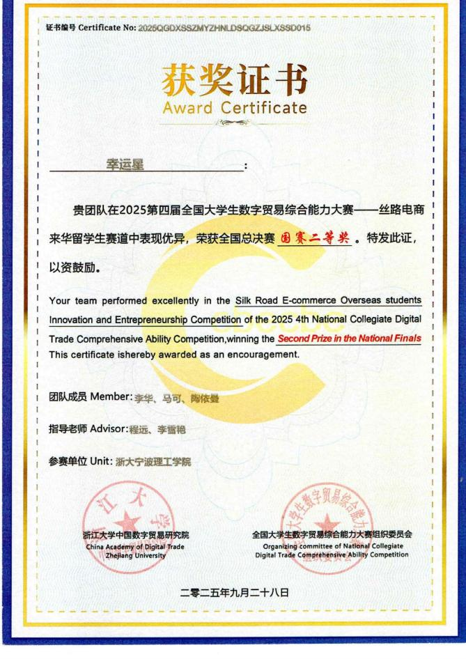 9月28日,我校国际学生团队在第四届全国大学生数字贸易综合能力大赛——“丝路电商”来华留学生创新创业大赛暨东方杯“我为家乡代言”(国际组)中荣获全国二等奖。作为宁波市唯一一支入围此赛道全国决赛的队伍,展现了我校国际教育的丰硕成果。