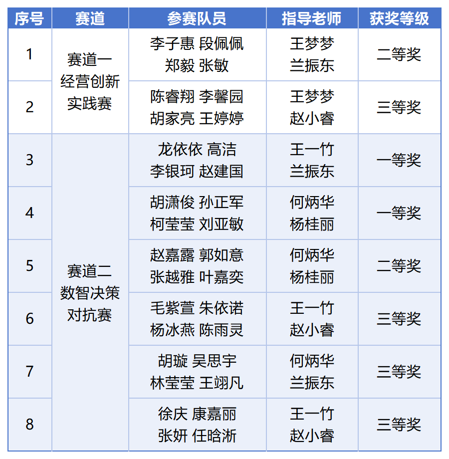 我校选派八支参赛队伍,在本届省赛中表现优异,全部获奖,共斩获一等奖2项、二等奖2项、三等奖4项,获奖数量与质量位居全省前列,充分展现了我校在数智化商科人才培养方面的扎实基础与突出成效。