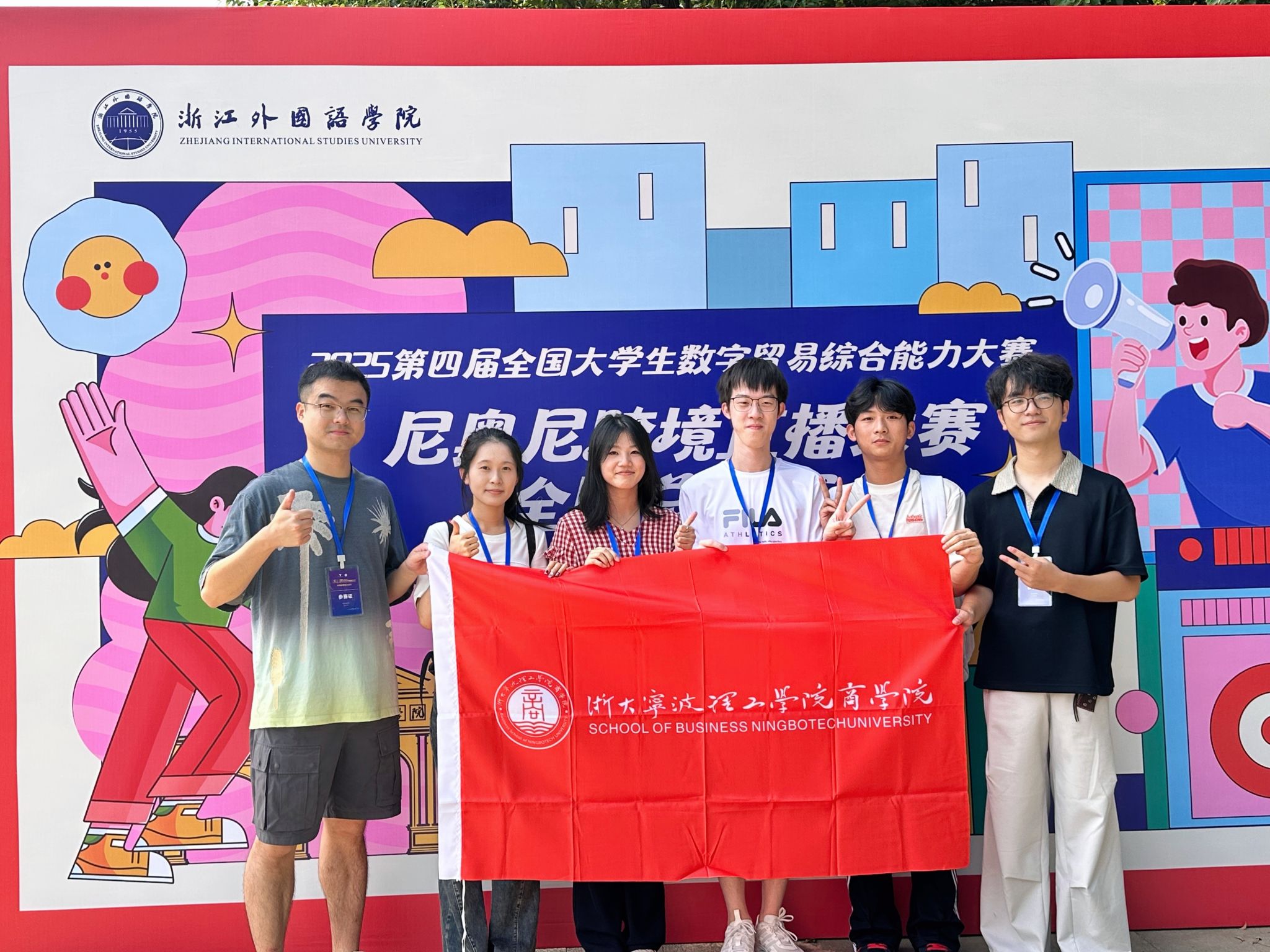 队长陈凯丽,队员孙舒逸、郑毅、王翊凡、丁宇杰在何巨、张家滋老师的指导下,荣获尼奥尼跨境直播赛全国三等奖。