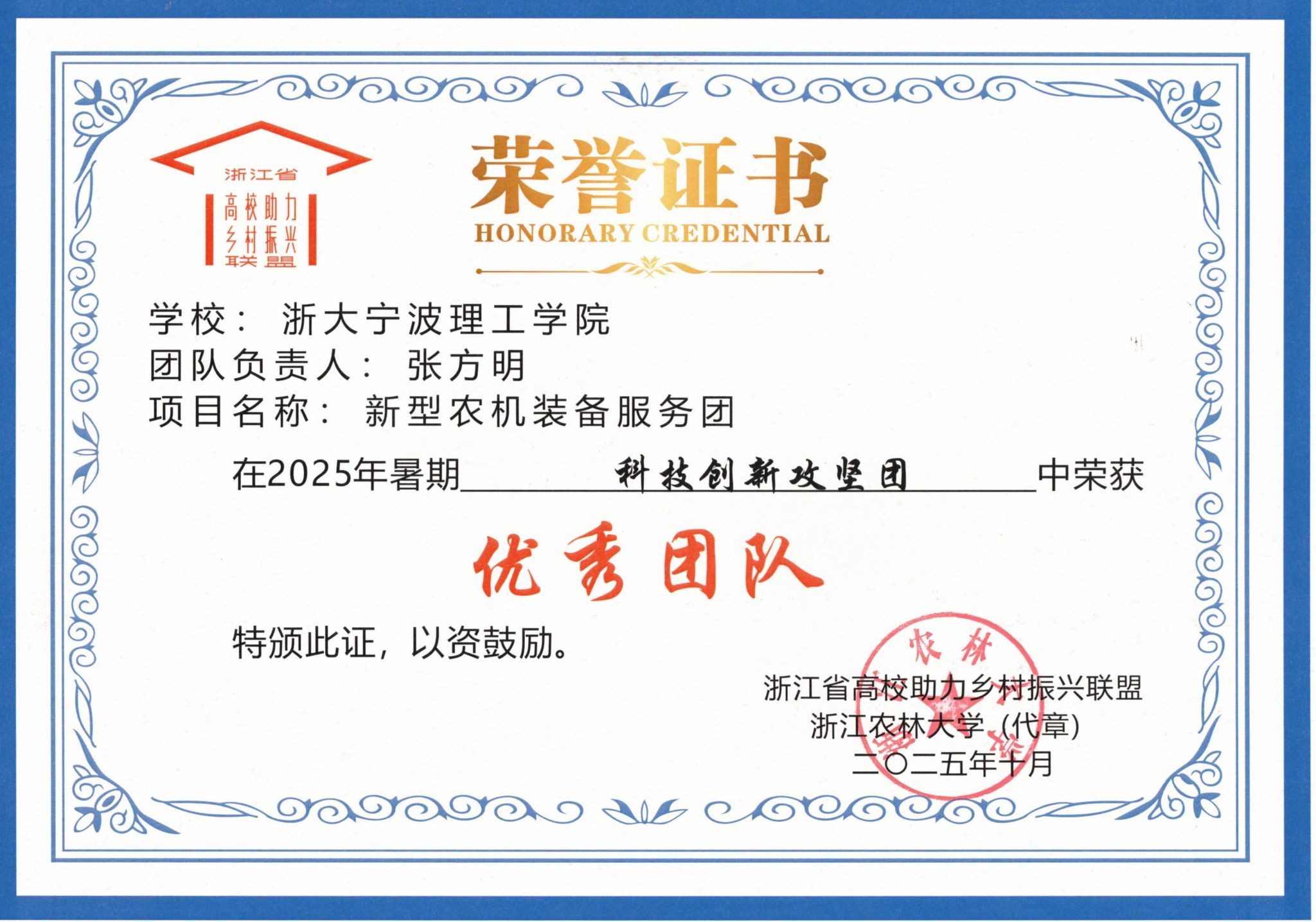 机能学院张方明老师负责的新型农机装备服务团深入宁波乡村一线,聚焦农业生产技术痛点,为2家农机企业、2家合作社提供蔬果采摘机械手研发、智能灌溉系统优化、农用拖拉机性能改进等技术服务,以科技实践助力乡村振兴,获评“科技创新攻坚团优秀团队”。