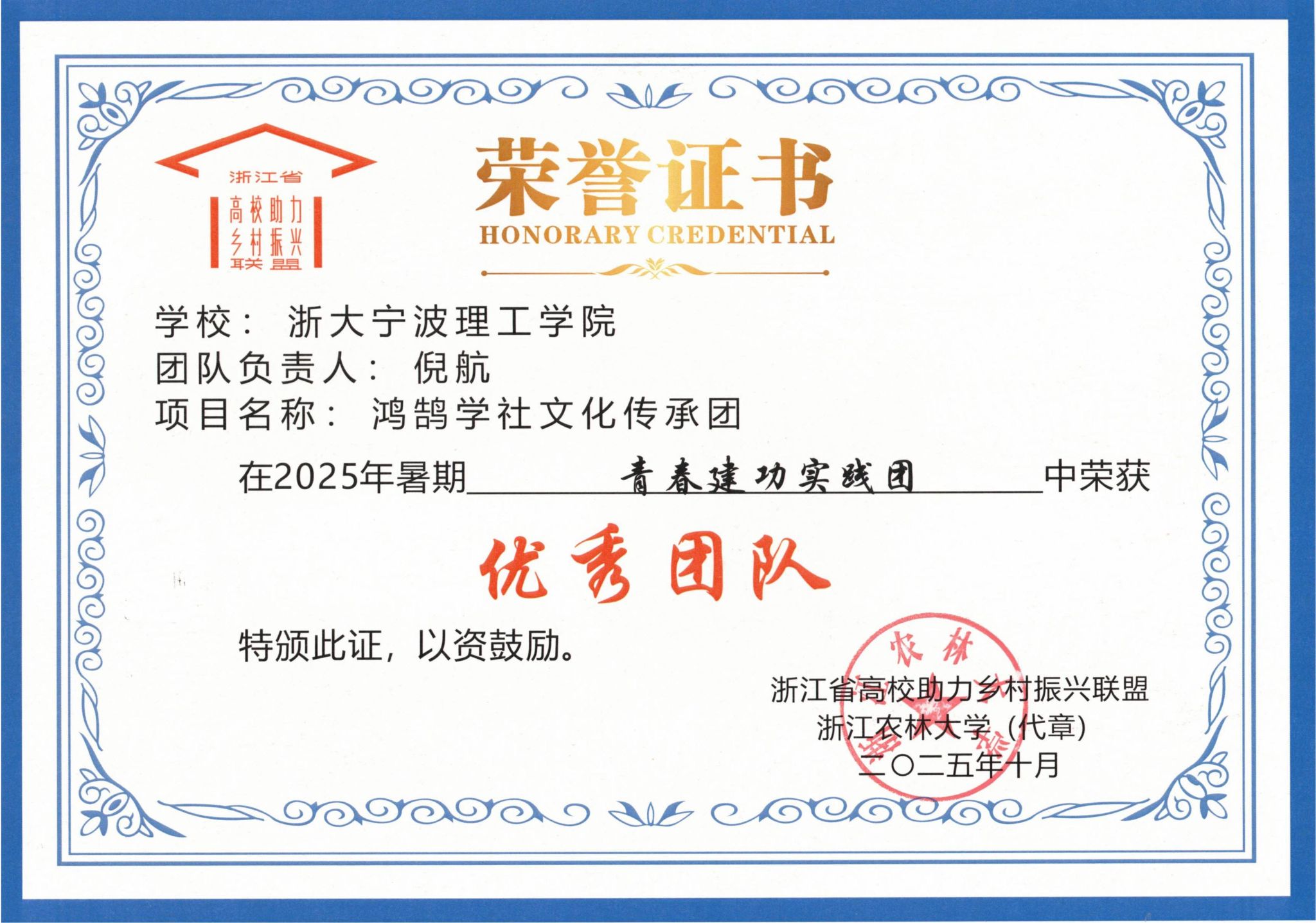 设计学院倪航同学负责的鸿鹄学社文化传承团以“生成式AI赋能乡村文化”为主题,在鄞州区开展文化支教、文创IP设计、红色非遗墙绘及“乡村画廊”等活动,探索人工智能与乡村文化的深度融合,获评“青春建功实践团优秀团队”。