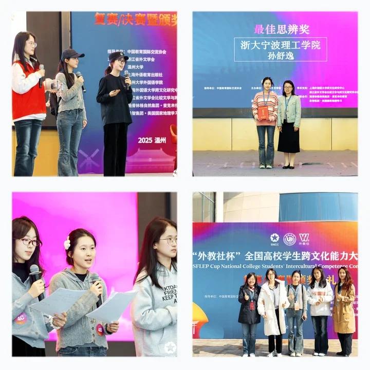2025年11月21日至22日,第八届“外教社杯”全国高校学生跨文化能力大赛(浙江赛区)在温州大学成功举行。省内共28所高校派队参加了本次赛事。由浙大宁波理工学院外国语学院选送的跨专业组合的参赛团队(孙舒逸、方诺、吴笑曼),在我校教师的指导与带领下,精心备赛、奋力拼搏,最终凭借扎实的专业功底、出色的英语表达与跨文化沟通能力,摘得省级一等奖荣誉。外国语学院英语234班孙舒逸同学脱颖而出,获得全场唯一的个人最佳思辨奖。