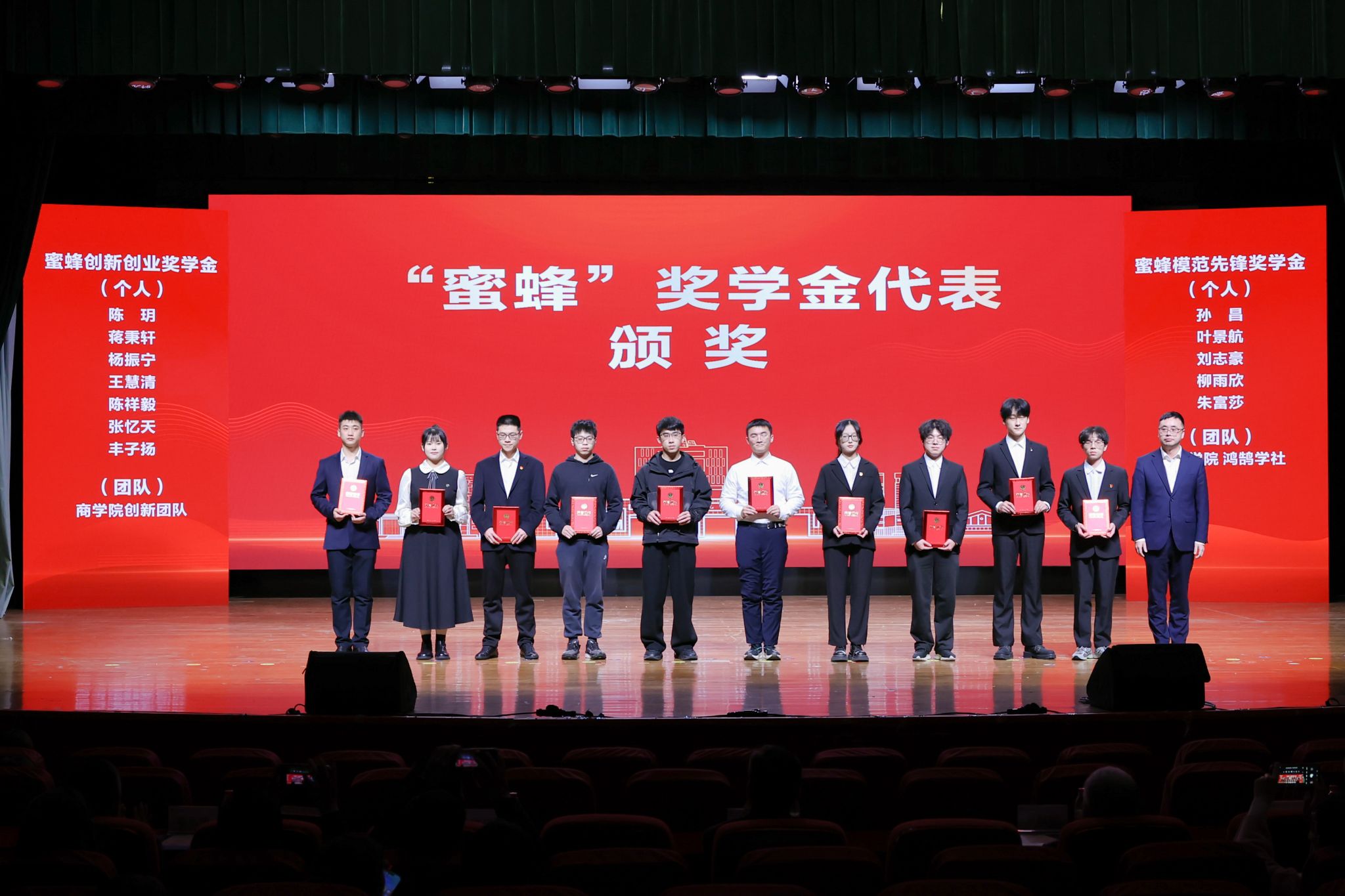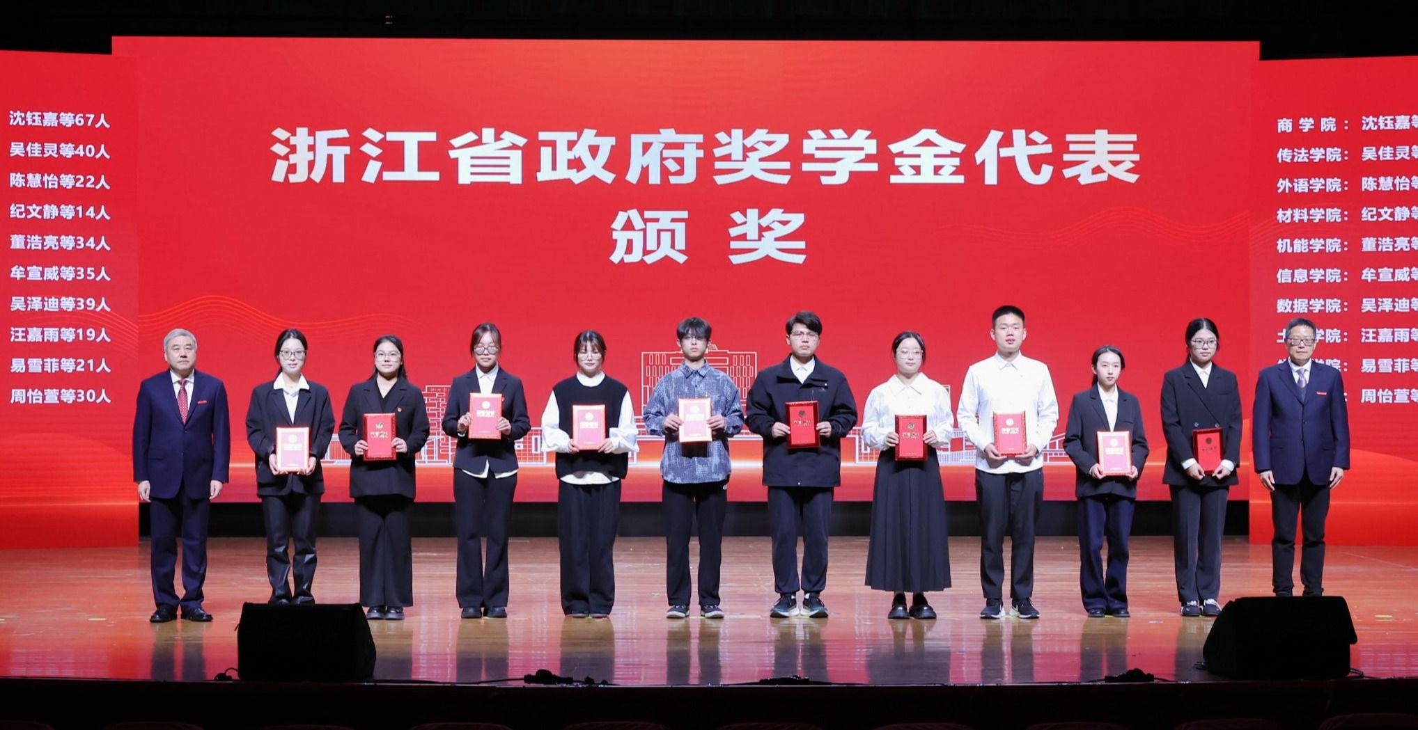 副校长章献民、鲁东明共同为浙江省政府奖学金获奖代表,宁波市优秀大学生、大学生励志标兵,学校奖学金获奖代表以及学校励志先锋、十佳学生提名奖获得者颁奖。