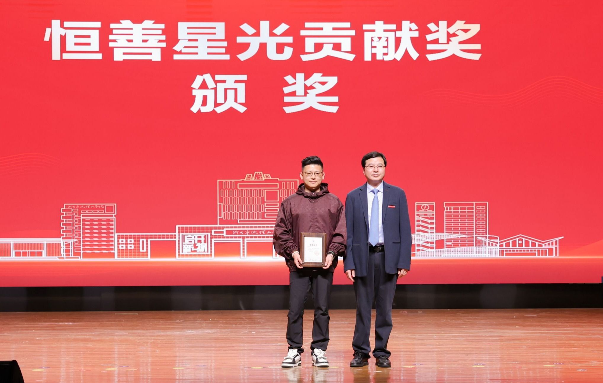 党委副书记杨国富为2006级金融学专业校友胡日恒颁发“恒善星光”贡献奖。自2015年起,胡日恒校友连续十年捐赠设立“恒善校友基金”,为学校遭遇困境的师生持续送去温暖与帮扶,这份持久的善举已成为连接校友与母校深情厚谊的动人见证。