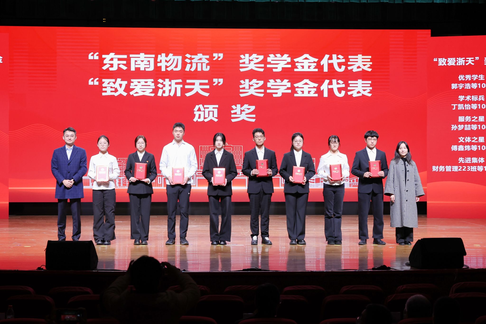宁波港东南物流集团、浙天集团有限公司、宁波瑞能集团股份有限公司、浙江英禾实业有限公司、大连连城数控机器股份有限公司、浙江宝兴智慧城市建设有限公司、宁波新芝生物科技股份有限公司、宁波凯越集团有限公司、鄞州银行等企业代表分别为获得企业奖学金的学生代表颁奖,勉励他们勤奋向学、锤炼本领,未来积极回报社会、贡献行业。