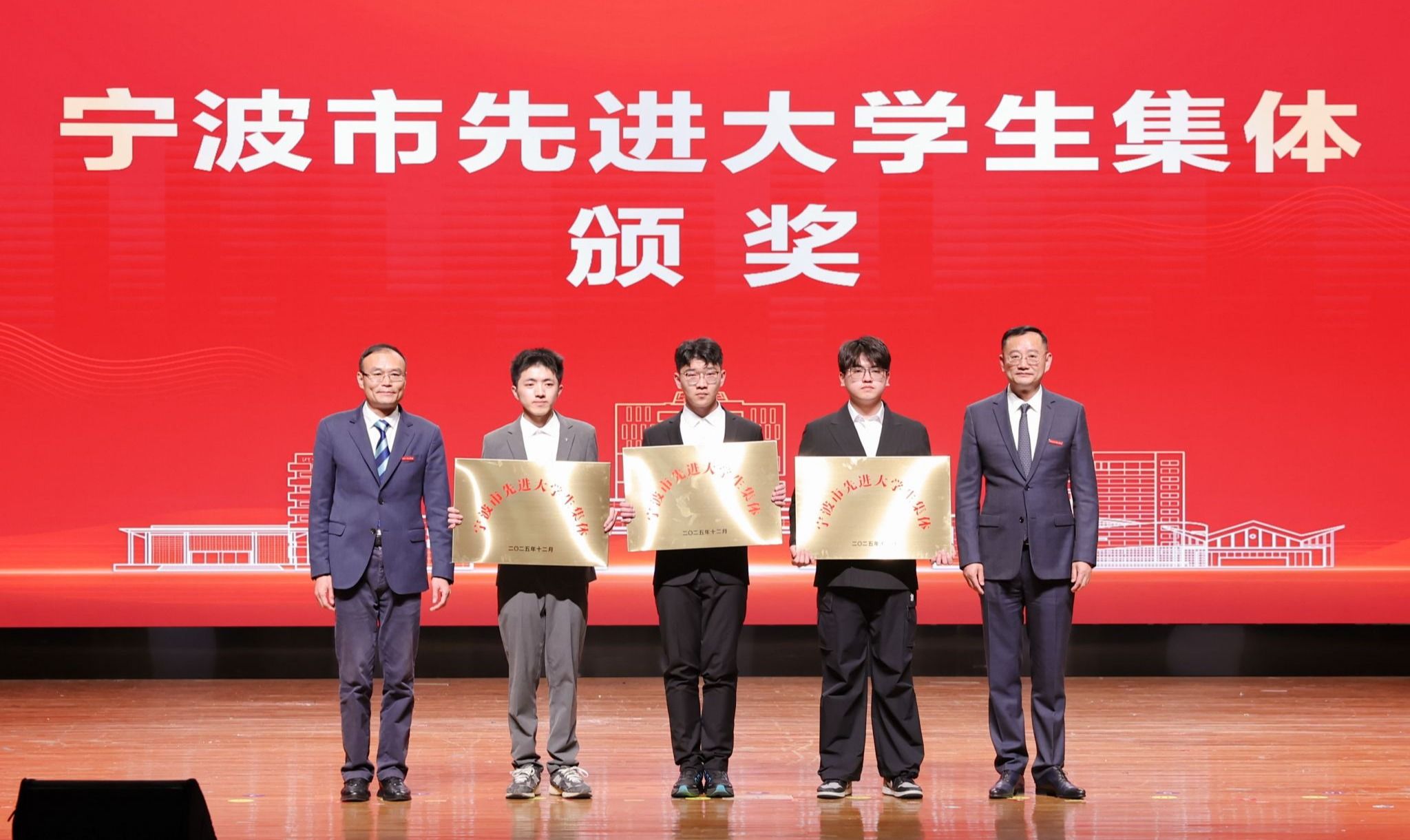 副校长张荣祥、纪委书记胡文汉共同为宁波市先进大学生集体以及教风学风一体化建设先进单位、先进班级、优良学风示范班和文明寝室获奖代表颁奖,表彰他们在集体建设和学风示范中发挥的示范和引领作用。
