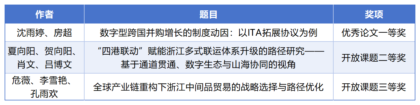 沈雨婷老师等人的《数字型跨国并购增长的制度动因:以ITA拓展协议为例》以ITA拓展协议为切入点,从制度视角探讨信息技术产品贸易自由化如何影响数字型跨国并购的增长,获得年会优秀论文成果一等奖,并在分论坛进行了报告。夏向阳老师等人的《“四港联动”赋能浙江多式联运体系升级的路径研究——基于通道贯通、数字生态与山海协同的视角》获得开放课题二等奖;危薇、李雪艳等老师的《全球产业链重构下浙江中间品贸易的战略选择与路径优化》获得开放课题三等奖。
