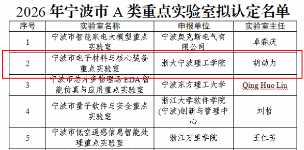 4月8日,宁波市科学技术局公布2026年度宁波市A类重点实验室认定名单,浙大宁波理工学院牵头建设的“宁波市电子材料与核心装备重点实验室”成功获批。学校紧扣国家重大战略与宁波“361”现代化产业体系发展需求,在集成电路、绿色能源和高端装备等领域持续发力,此次获批标志着学校科研平台建设取得重要突破。