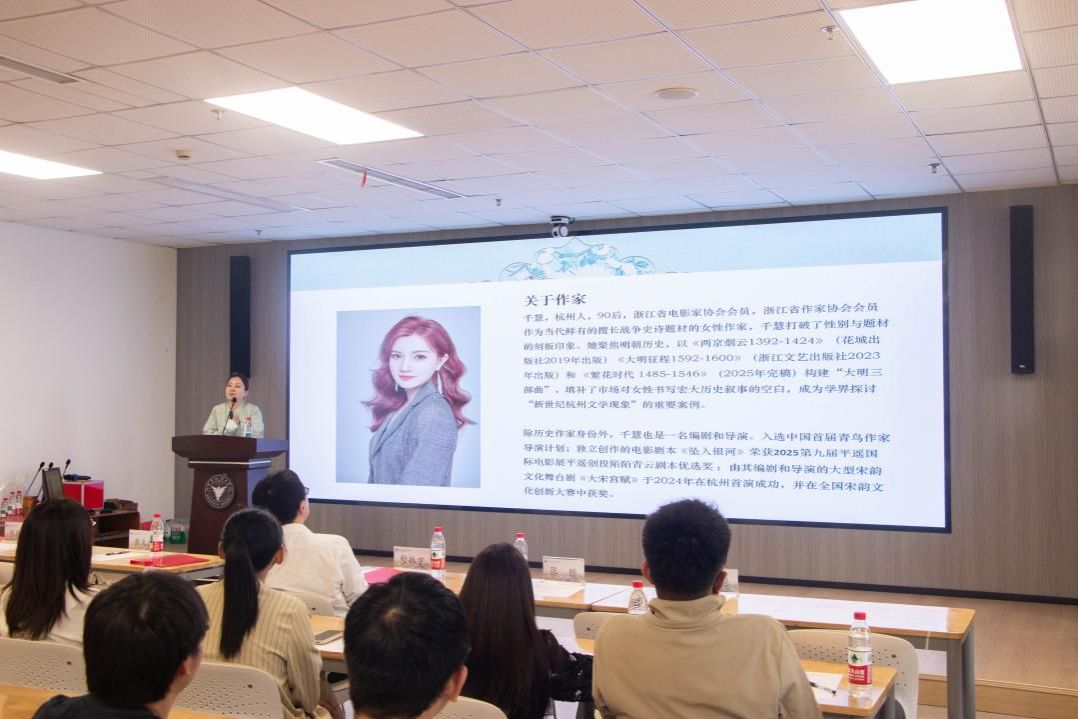启动仪式后,馆藏作品作者见面会温情启幕。浙江省作家协会会员、浙江省电影家协会会员、中国首届青鸟作家导演计划入选作家千慧做客学校。千慧为现场师生带来了一场兼具历史深度与文化美感的分享,带领大家沉浸式领略明代服饰的美学意蕴与历史底蕴,现场氛围热烈,掌声不断。