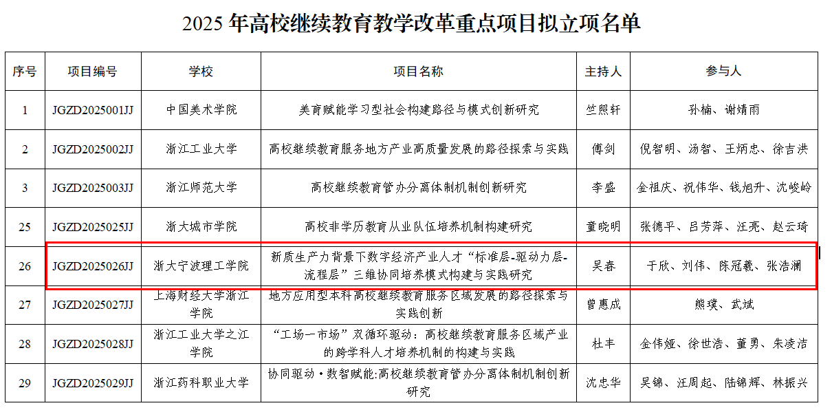 4月13日,浙江省教育厅办公室公布2025年高等职业教育和高校继续教育教学改革项目,由继续教育学院院长吴春主持的《新质生产力背景下数字经济产业人才“标准层—驱动力层—流程层”三维协同培养模式构建与实践研究》项目成功入选。