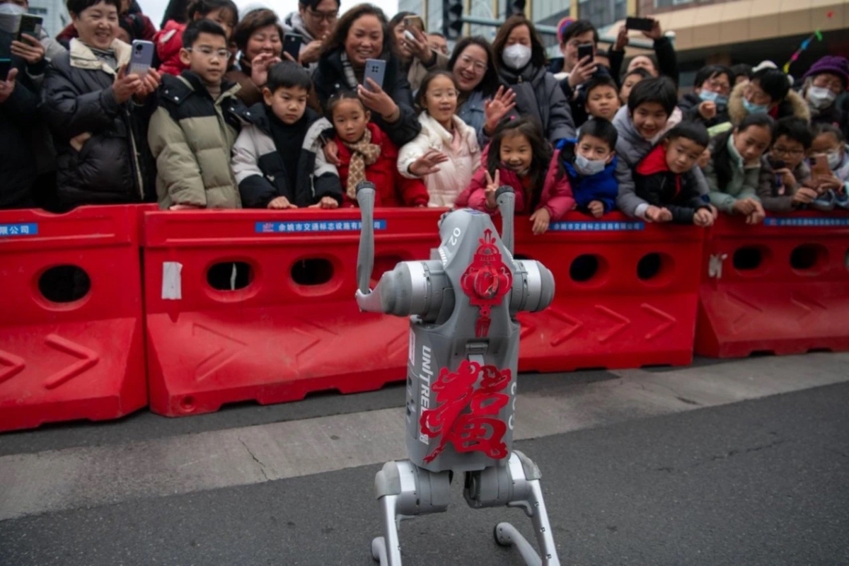 在王阳明故居广场,“阳明故里余姚年·幸福巡游闹元宵”活动热闹非凡,来自“宇树科技”的机器狗“笨笨”更是吸引了不少孩子的目光,它身披余姚剪纸图案,灵活地穿梭于队伍中,与观众击掌互动,其精准的步态控制和AI交互能力引发阵阵惊叹……