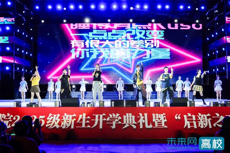 随着烟花绽放,伴随着在场观众的热烈欢呼声,“启新之夜”迎新生晚会华彩上演。原创歌曲《东临大海》以歌伴舞结合民乐器乐,展现青春活力,表演者歌声悠扬,舞步蹁跹,在乐与舞的对话中,同学们无不沉醉其中。随后,现代舞《生长》直击心灵,舞者们用优美的姿态展现人生漫漫长路,让在场师生身临其境,将大家带入到自然的生命里,给予新生向下扎根、向上生长的勇气。《一荤一素》《改变自己》《我是如此相信》《海芋恋》等不同风格的歌曲串烧则瞬间将温情的舞台点燃,表演者们火力全开,积极互动,台下随着欢快的节奏舞动喝彩,洋溢新青年的朝气蓬勃。刚柔并济的武术表演震撼全场,剑舞风云动,拳出天地惊,可谓行云流水。融合古琴与朗诵的《定风波》励志而不失雅致,女子群舞《从来银杏不负秋》温婉而不失气势,合唱互动《不要慌太阳下山还有月光》温馨而不失活力,群舞《不屈的脊梁》则更是优美而不失力量。精彩节目轮番登场,为观众带来了一场视听盛宴,掌声与欢呼声此起彼伏。晚会尾声,全场齐声高唱《我的祖国》,清澈的美声与恢弘的合唱交织,激荡起深深的爱国情怀与集体荣誉感,为这个充满希望与感动的夜晚画上了圆满的句号。