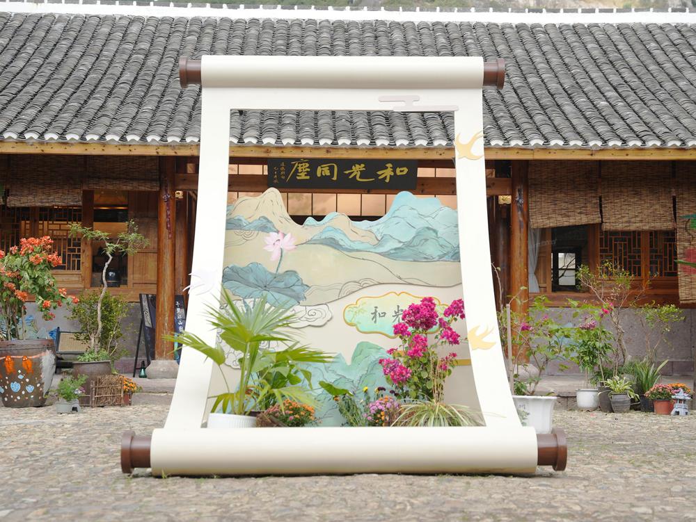 茅洋农民画主题馆,坐落于白岩下村和光院,简单质朴的木结构建筑如同形象质朴的农民画一样完美融入这片土地。硕大的艺术画框装置像土地生长的艺术容器,既有农民画扎根土地的滚烫,也有文创产品带着绚丽色彩奔赴日常的轻盈。