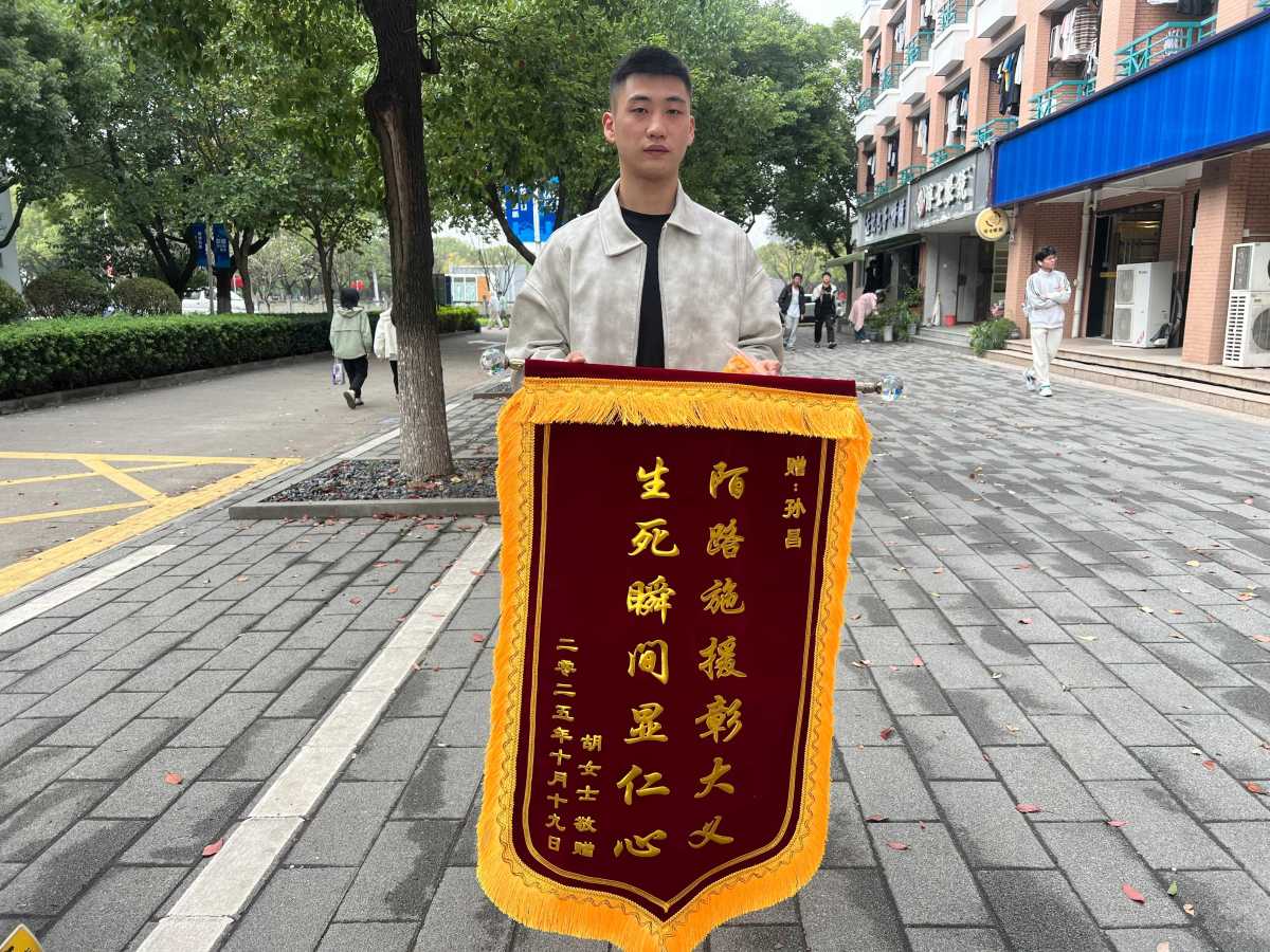 11月10日中午,浙大宁波理工学院学生孙昌收到了一份特殊的“礼物”——一面来自被救者胡女士的锦旗。