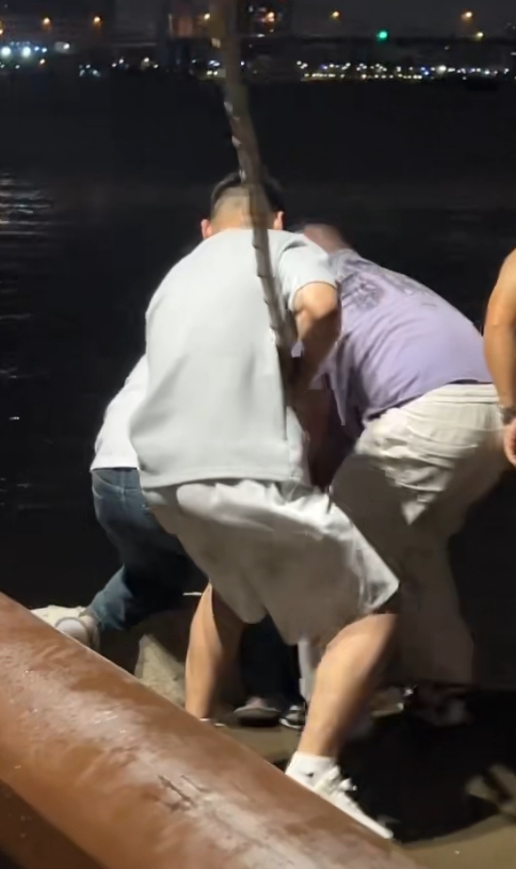 孙昌与现场其他好心人一起拉落水者上岸。受访者供图
