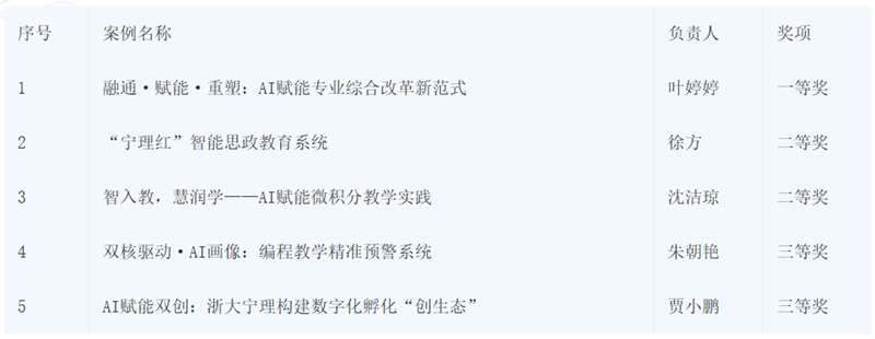近日,浙江省高等教育学会智能教育分会公布了《关于公布2025年AI赋能教育教学改革优秀案例获奖名单的通知》,浙大宁波理工学院推荐的5个案例全部获奖,其中一等奖1项,二等奖2项,三等奖2项。