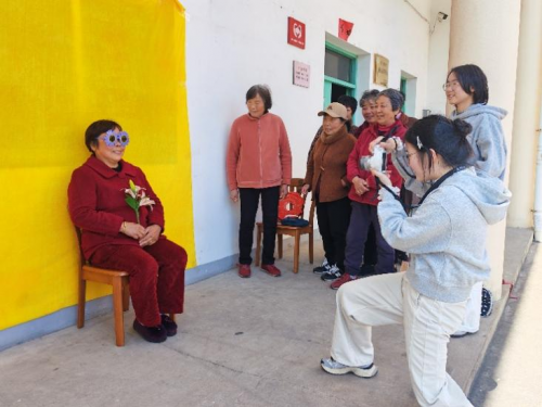拍摄现场,大学生们或蹲或站,耐心引导;老人们起初有些羞涩,渐渐放松下来,有的甚至主动“加戏”,戴着草帽回眸一笑,拿着道具摆出各样趣味姿势。镜头内外,笑声不断。“奶奶,再酷一点!对,看这边!”随着快门声响起,老人的笑容被定格。