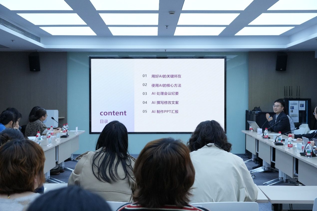 活动特邀商学院尹晖副教授作专题分享。尹晖紧扣教务员日常工作,围绕资料整理、文案撰写、PPT制作、数据处理、图片优化等高频办公场景,通过实操演示,系统讲解多款AI工具的使用方法与技巧,拆解提示词撰写核心逻辑,分享高效办公万能公式,把AI工具转化为提升工作效率的实用抓手。与会人员现场互动交流、上手实操,收获满满。