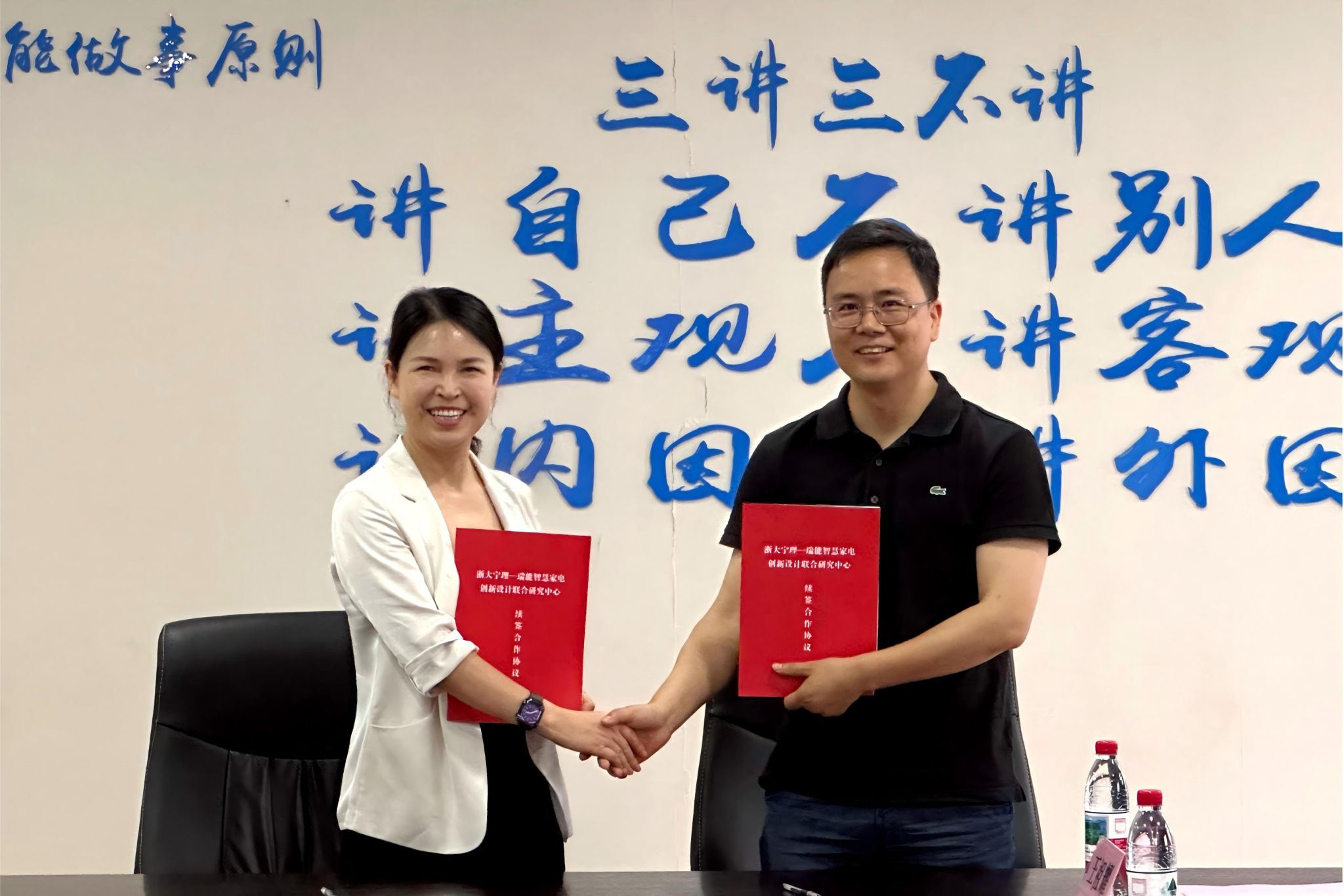 为深化产学研融合,共筑智能家电创新高地,6月30日下午,“浙大宁理—瑞能智慧家电创新设计联合研究中心”续签仪式在宁波瑞能集团股份有限公司隆重举行。此次续签标志着双方合作迈入新阶段,将进一步深化产学研协同创新,为区域智能家电产业高质量发展注入新动能。浙大宁波理工学院科研处副处长李义杰、设计学院院长陈江、党委书记韩晶晶等校方代表,与宁波瑞能集团股份有限公司董事长唐瑞峰、总经理王蓉萍等企业高管共同出席仪式。