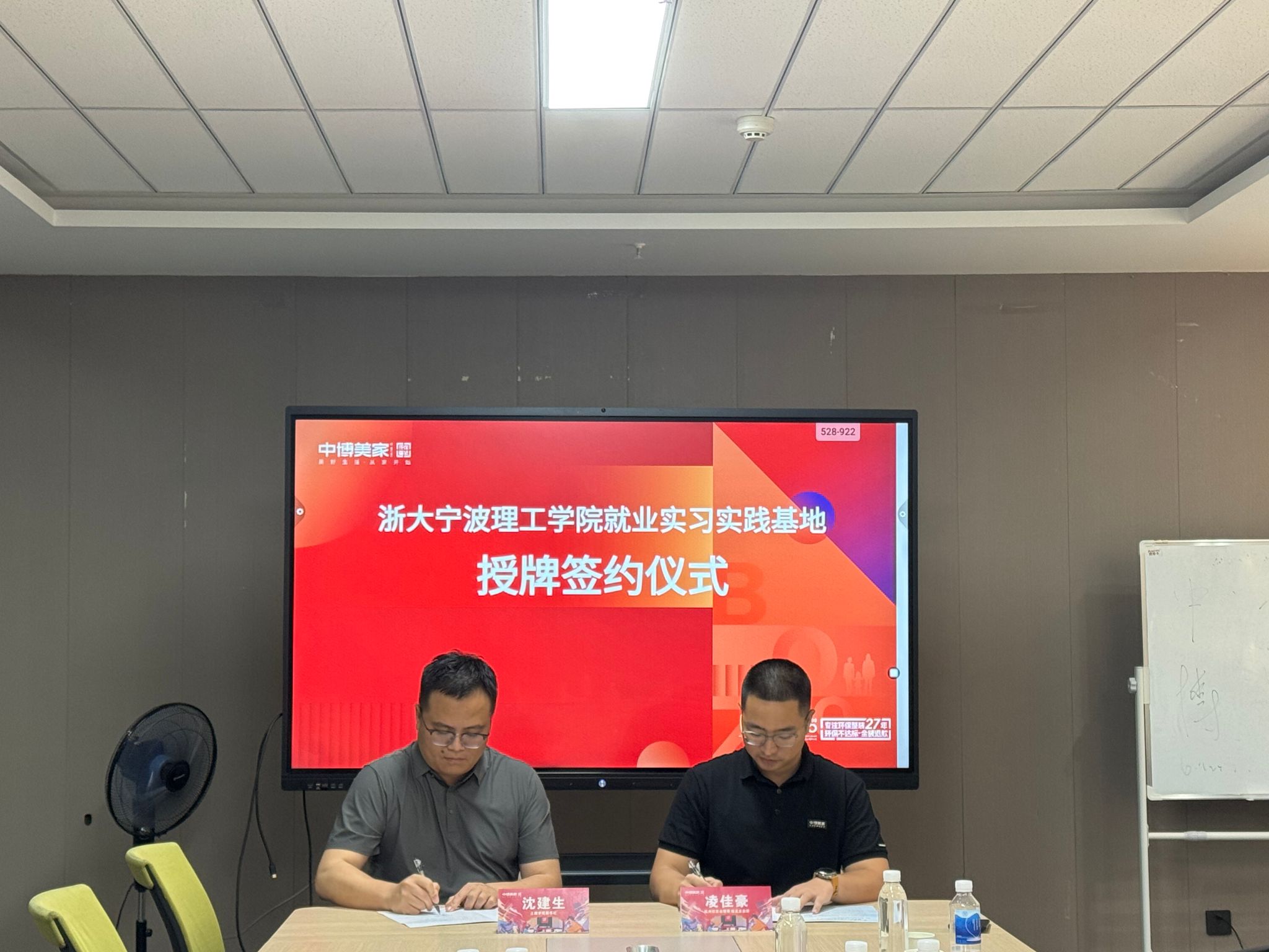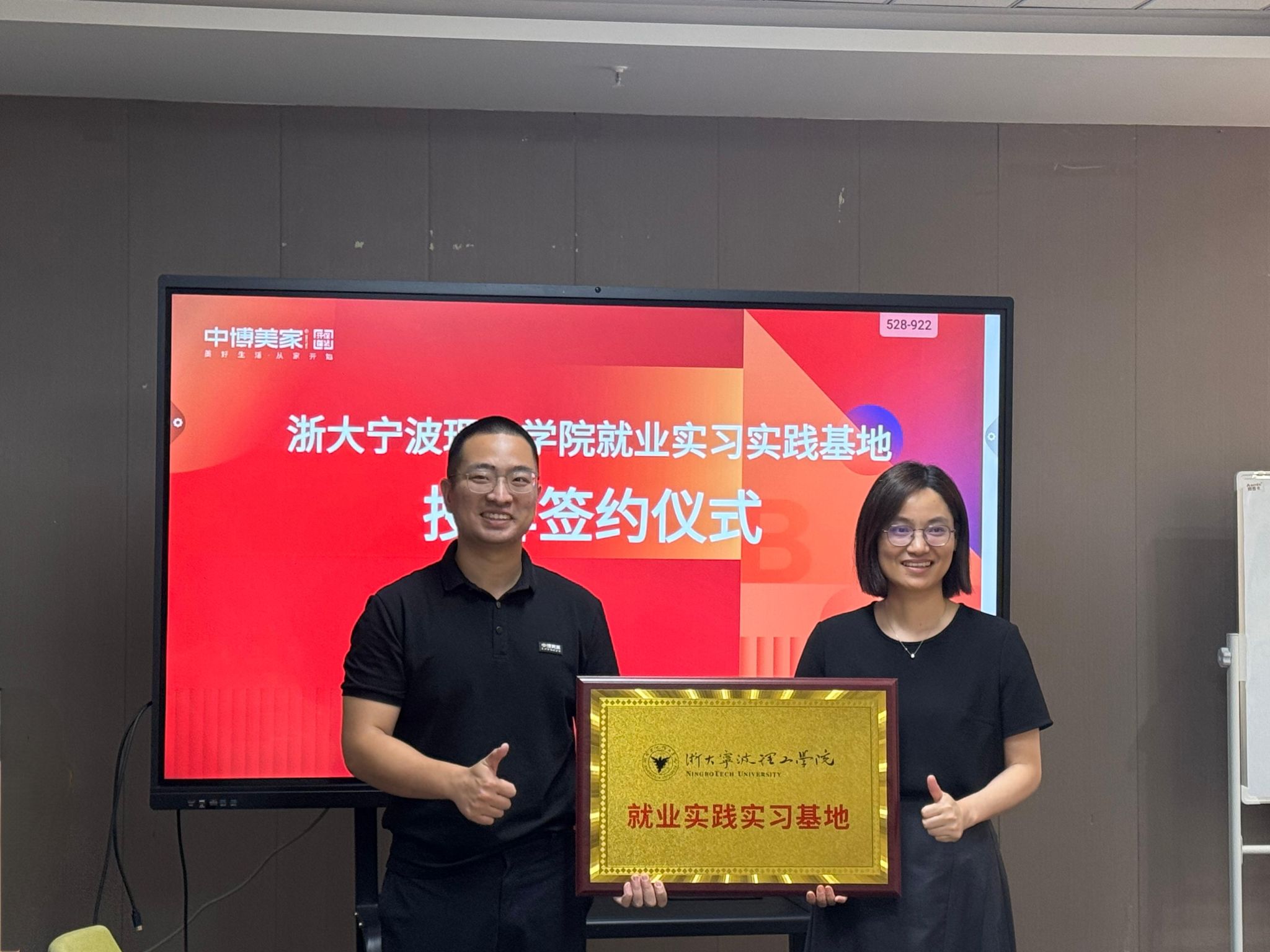 在浙江中博美家科技有限公司,学校一行在土建学院16届校友凌佳豪和彭晓平的陪同下参观了企业展厅,深入了解企业在智能家居、绿色建材领域的创新成果与市场布局。交流中,中博美家公司分享了行业发展趋势及对设计、营销、材料技术等复合型人才的迫切需求。学院党委副书记沈建生与中博美家科技有限公司副总裁凌佳豪签订了就业实习实践基地共建协议,土建学院党委书记王成为公司授就业实践实习基地牌。双方期待在联合开展人才培养、拓展毕业生优质就业岗位等方面开展实质性合作,实现校企资源的精准对接与互利共赢。