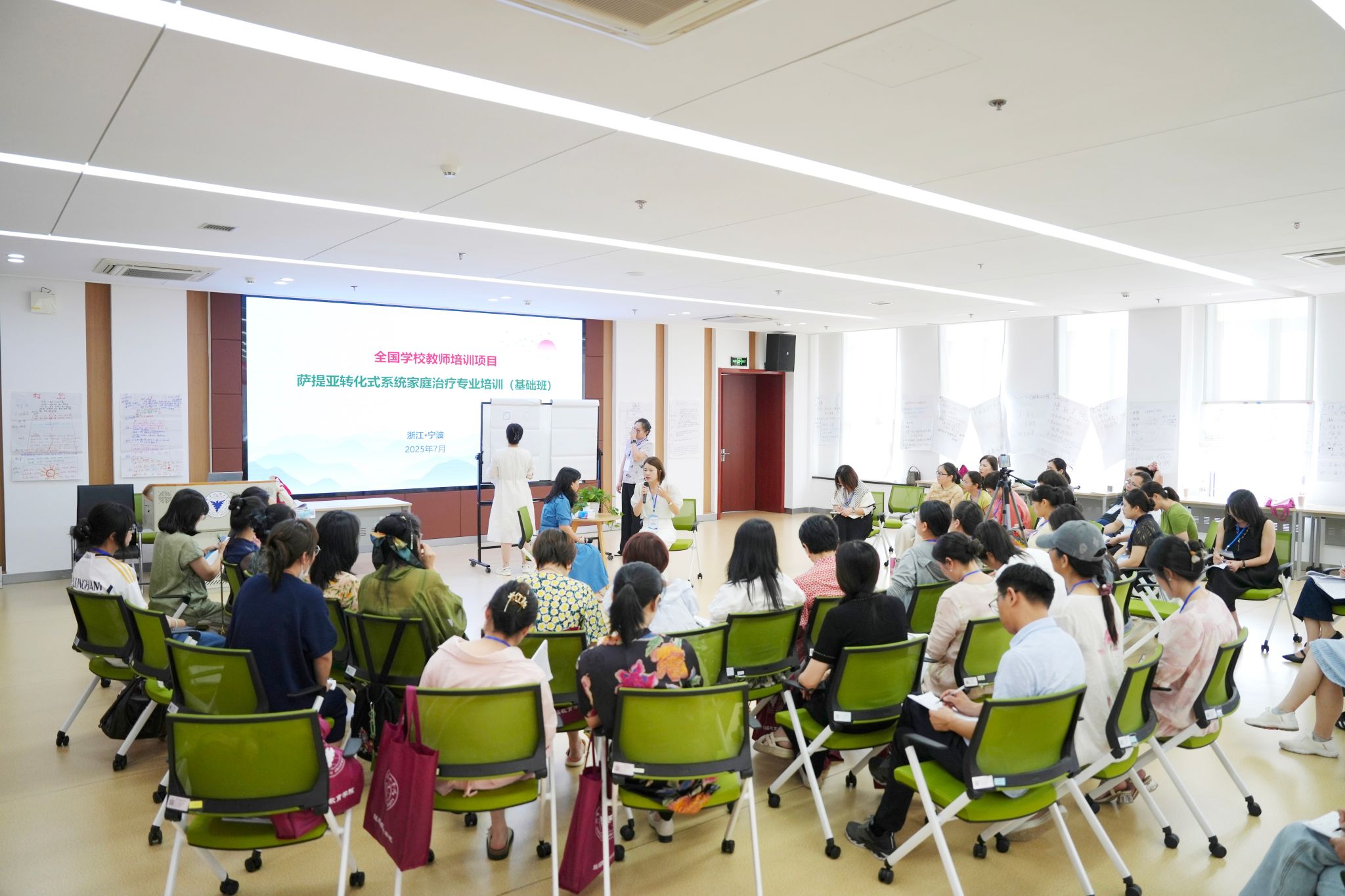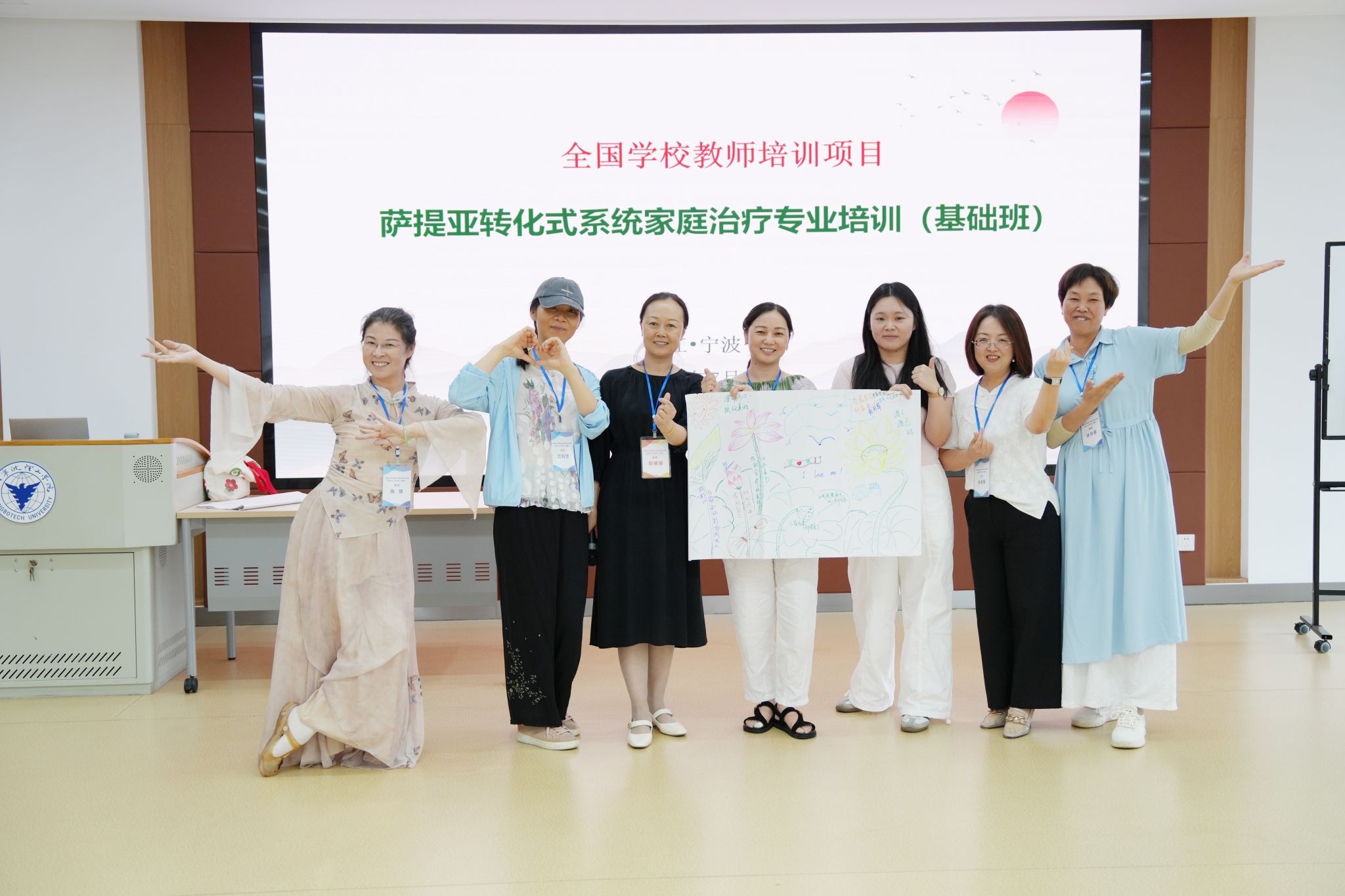 7月10日至18日,“积极心理学视域下萨提亚转化式系统家庭治疗专业培训(基础班)”在浙大宁波理工学院继续教育学院成功举办。来自浙江省内各地中小学的45位教师齐聚一堂,共同开启了一场深刻的内在探索与系统的专业赋能之旅。