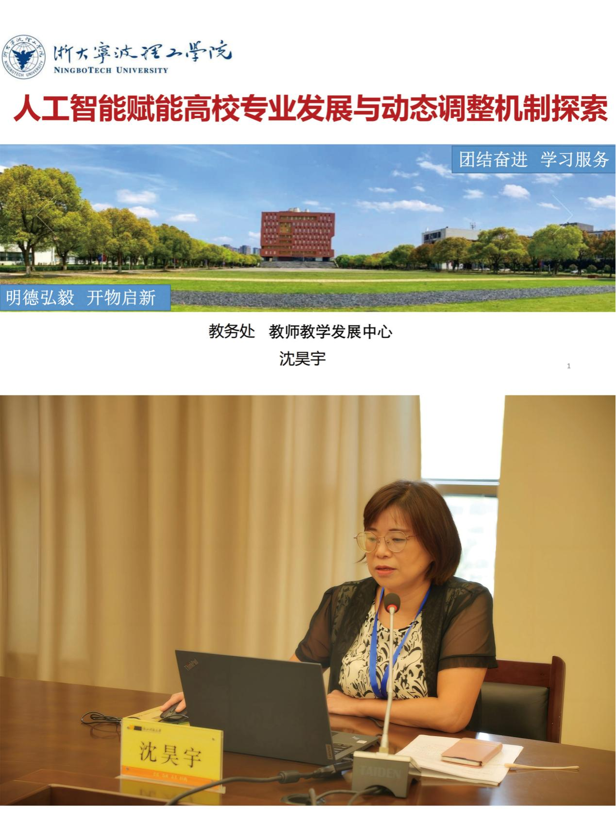 我校教务处处长沈昊宇教授受邀出席,并作题为“人工智能赋能高校专业发展与动态调整机制探索”的主题报告。沈昊宇教授从AI赋能专业发展与动态调整的思考与实践,分享了我校在省教育厅指导下,我校人工智能+教育研究中心在AI赋能专业发展与动态调整指标体系构建,省域、市域专业设置对接浙江省415X和宁波市361产业的适配度数智画像,以及我校专业设置评价模型、评估结果与专业画像建设情况,受到了与会专家的认可和赞赏。