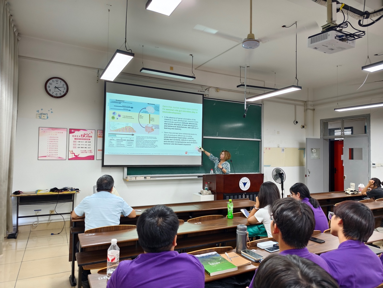 9月24日下午,Yamasaki Patrikiou教授为生化学院2025级生物工程专业新生讲授题为“Maternal Microbiome and Brain Development(母体微生物组与大脑发育)”的导论与导学课程。Yamasaki Patrikiou教授系统阐述了“肠-脑轴”的双向通讯机制,重点分析母体肠道菌群如何通过多种途径影响子代大脑发育的关键期。通过分析饮食、分娩方式、环境等因素对菌群的塑造作用,讨论菌群多样性与脑健康和神经退行性疾病的关联,揭示微观菌群与宏观健康的内在联系,激发了同学们对生命科学的浓厚兴趣。