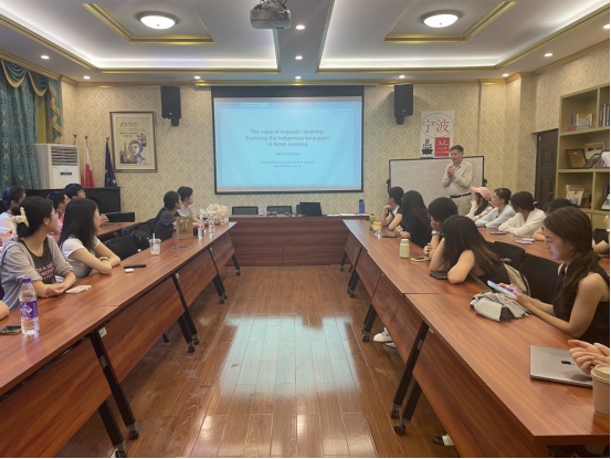 9月28日下午,Marcin副教授还为学院学生带来了一场题为“The value of linguistic diversity: Exploring the Indigenous languages of North America”的学术讲座。他以北美原住民语言为切入点,深入剖析了易洛魁语系、萨利希语系等在语音系统与语法结构上的独特性,指出语言差异不仅体现了人类语言的多元性,也反映了语言使用者之间复杂的历史互动。他特别强调,传统研究常忽略“特征为何缺失”的问题,而他的研究揭示,某些语言特征可能以变体形式潜藏于特定语境中。这一视角为语言类型学与历史语言学提供了新的研究方向,激发了在场师生对濒危语言保护与跨文化语言研究的浓厚兴趣。