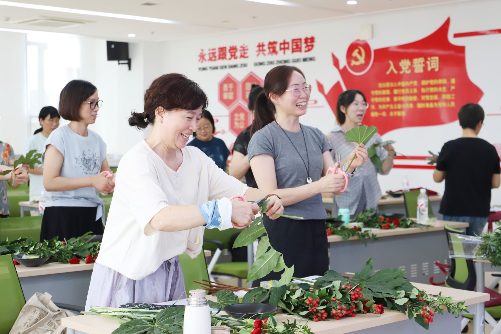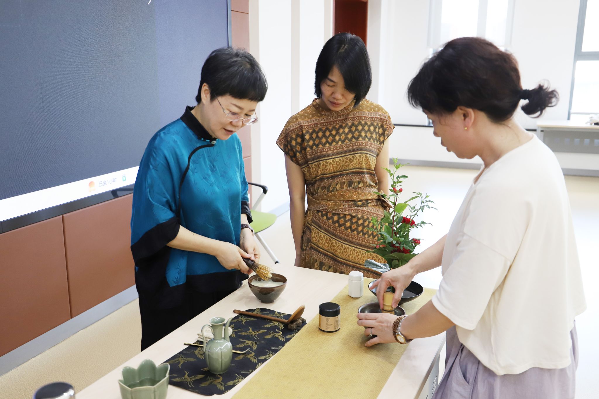 在传统插花艺术体验课上,参训教师们暂时放下粉笔,专注于手中的花枝、叶片与器皿,在动手实践中舒缓紧绷的神经。