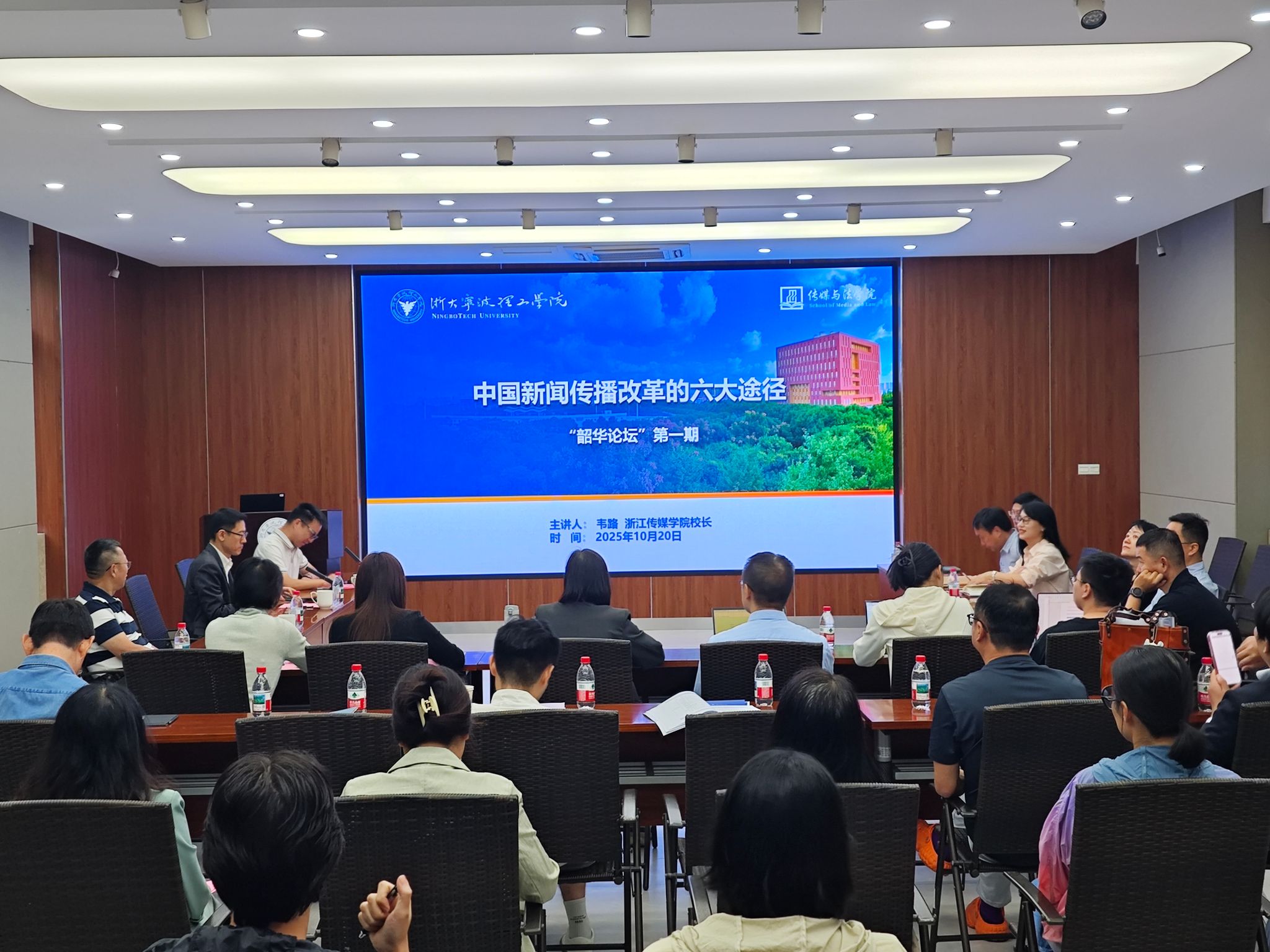 2025年10月20日,传媒与法学院“韶华论坛”首期活动顺利举办。浙江传媒学院校长韦路教授受邀担任主讲嘉宾,学校副校长章献民、职能部门负责人及传法学院领导班子、师生代表共同参与。
