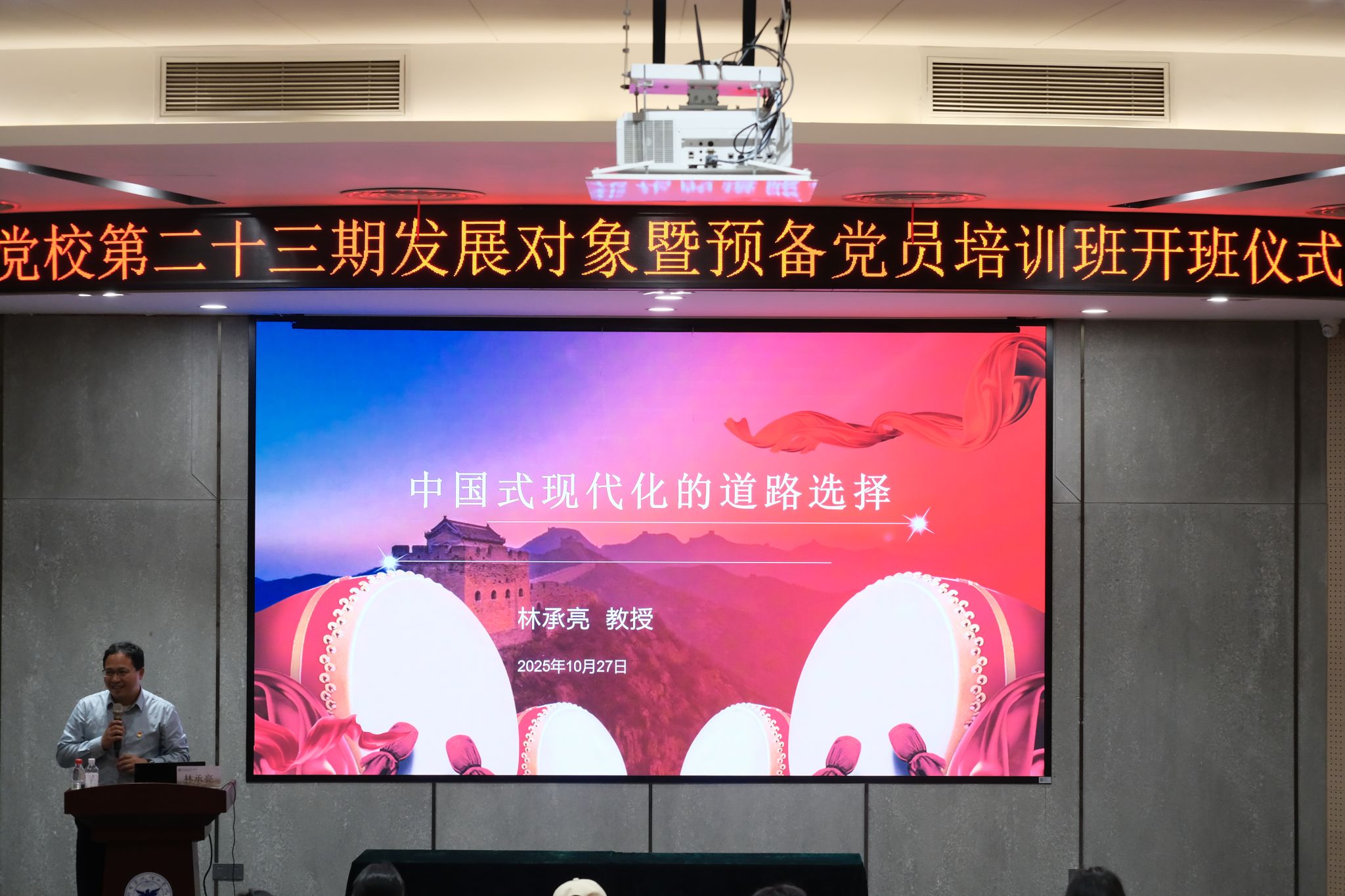 发展对象培训班学员周雨倩、预备党员培训班学员施心悦作为学员代表发言。开班仪式后,教师工作部部长、党支部书记林承亮作《中国式现代化的道路选择》专题辅导报告。