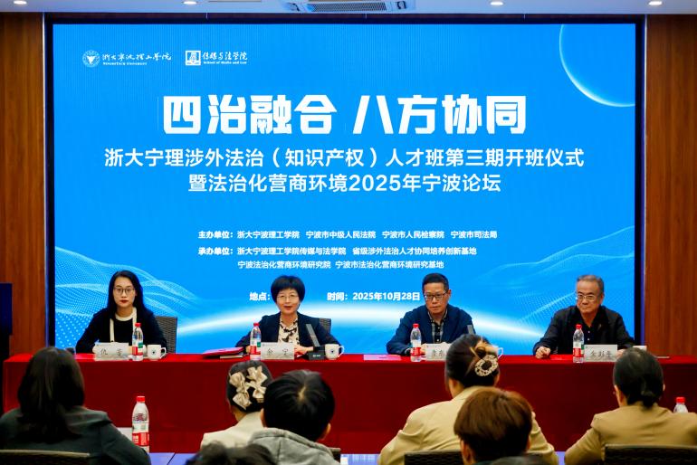 为深入贯彻落实习近平总书记关于涉外法治建设的重要指示精神,以“四治融合”理念创新人才培养体系,助力宁波外向型经济高质量发展,我校于2025年10月28日下午举行“涉外法治(知识产权)人才班(第三期)”开班仪式。活动汇聚政府、高校、法院、律所等八方力量,以多维度协同育人格局,共同擘画涉外法治人才培养新蓝图。