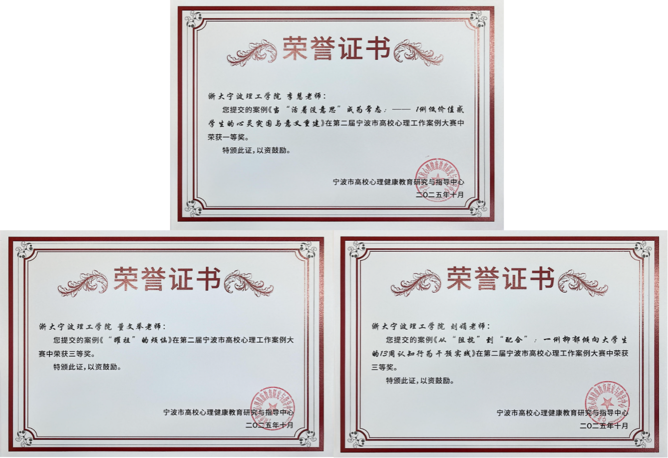 心理健康教育咨询中心李慧老师的《当“活着没意思”成为常态:一例低价值感学生的心灵突围与意义重建》荣获一等奖;董文举老师《“耀祖”的烦恼》与刘娟老师《从“阻抗”到“配合”:一例抑郁倾向大学生的13周认知行为干预实践》分别荣获三等奖。