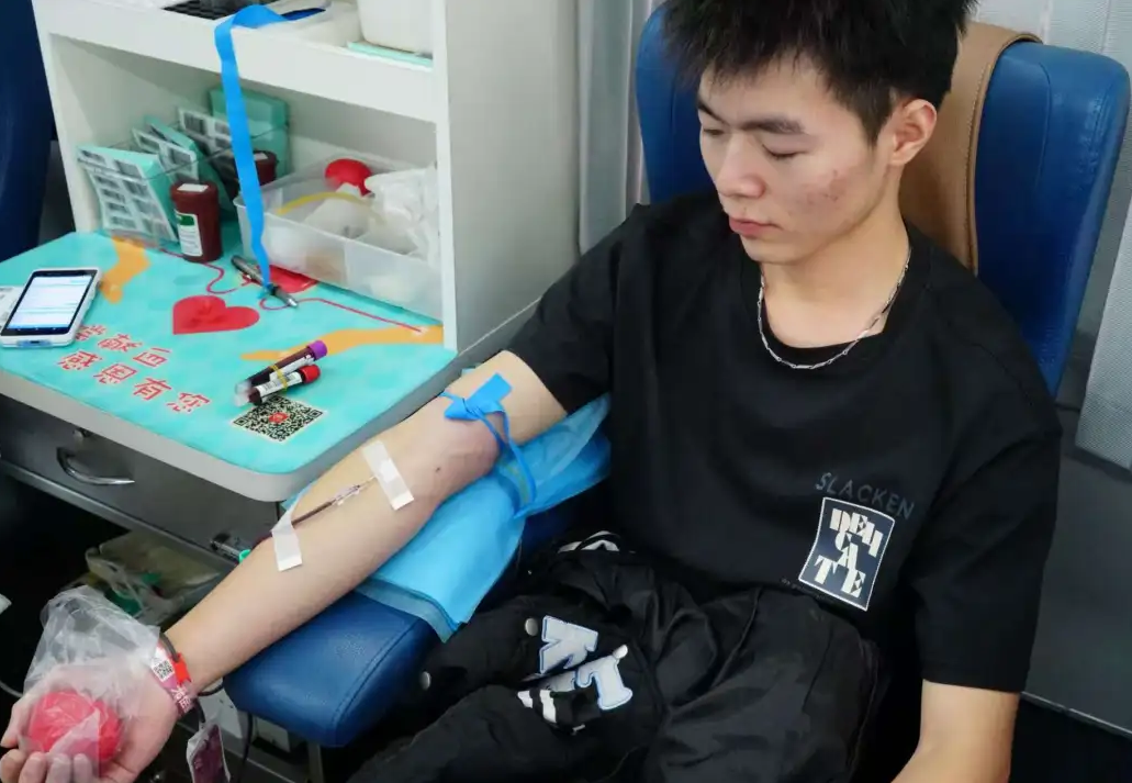 设计学院新生罗同学在室友的陪伴下,完成了人生中第一次献血。“针头扎入的瞬间确实紧张,但想到此刻正在发生的生命接力,忽然就充满了勇气。”罗同学笑着分享道。同行的室友被现场氛围深深感染,当场填写献血登记表,加入到献血队伍中。