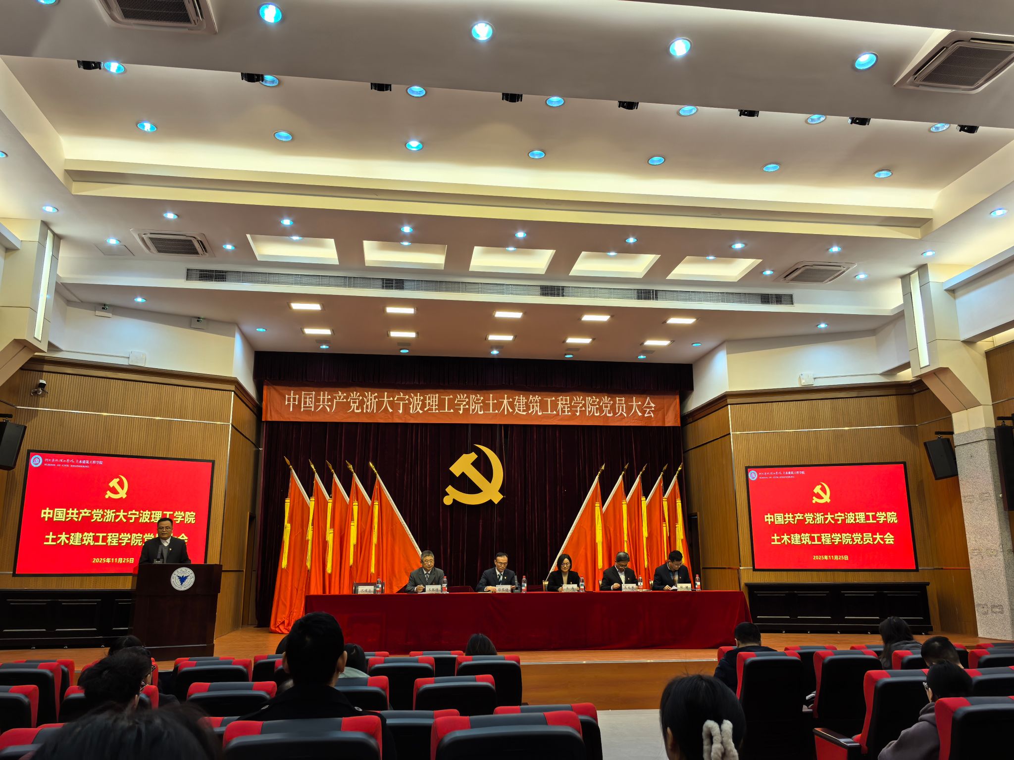 2025年11月25日,中国共产党浙大宁波理工学院土木建筑工程学院党员大会在金宗城法学教学中心召开。本次大会是在全院上下深入学习贯彻党的二十届四中全会精神、全面落实教育强国战略部署,系统总结“十四五”发展成就、科学谋划“十五五”发展蓝图的关键时期召开的一次重要会议。学校党委委员、副校长张荣祥出席大会。大会由学院党委副书记沈建生主持,学院全体师生党员参会,民主党派、党外人士代表受邀列席。