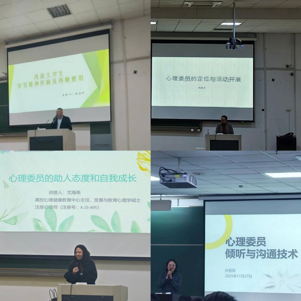 本次培训邀请专业的精神科医生、心理咨询师联合开展,主题分别为《浅谈大学生常见精神疾病及药物使用》《心理委员的定位与活动开展》《心理委员的助人态度和自我成长》《心理委员倾听与沟通技术》。