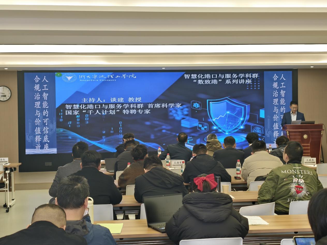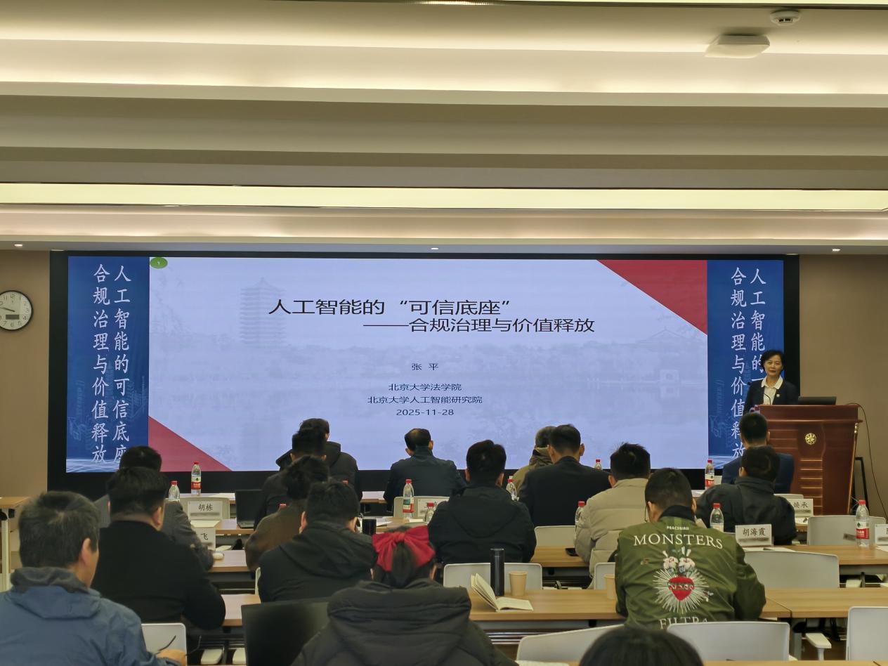 2025年11月28日,智慧化港口与服务学科群邀请北京大学人工智能研究院人工智能安全与治理研究中心主任、北京大学武汉人工智能研究院副院长、北京大学法学院教授、国家人工智能标准化总体组人工智能治理专题组组长张平教授来校作《人工智能的“可信底座”——合规治理与价值释放》讲座。讲座邀请了宁波市人大财政经济委员会副主任委员王光旭,宁波市司法局副局长、党委委员毛利奇,宁波市经信局人工智能推进中心项鹏程,宁波市数据局数据要素市场处朱佳栋,和宁波市人才服务有限公司、浙江宁数健康大数据运营有限公司、宁波电信、数字宁波科技有限公司、北京德恒(宁波)律师事务所、浙江和义观达律师事务所等相关单位,以及协办和支持单位:宁波市大数据发展协会、宁波市元宇宙学会、宁波市知识产权协会,和来自传媒与法学院、商学院、信息科学与工程学院、计算机与数据工程学院等承办单位的老师和学生。本次讲座由智慧化港口与服务学科群首席科学家谈建主持。