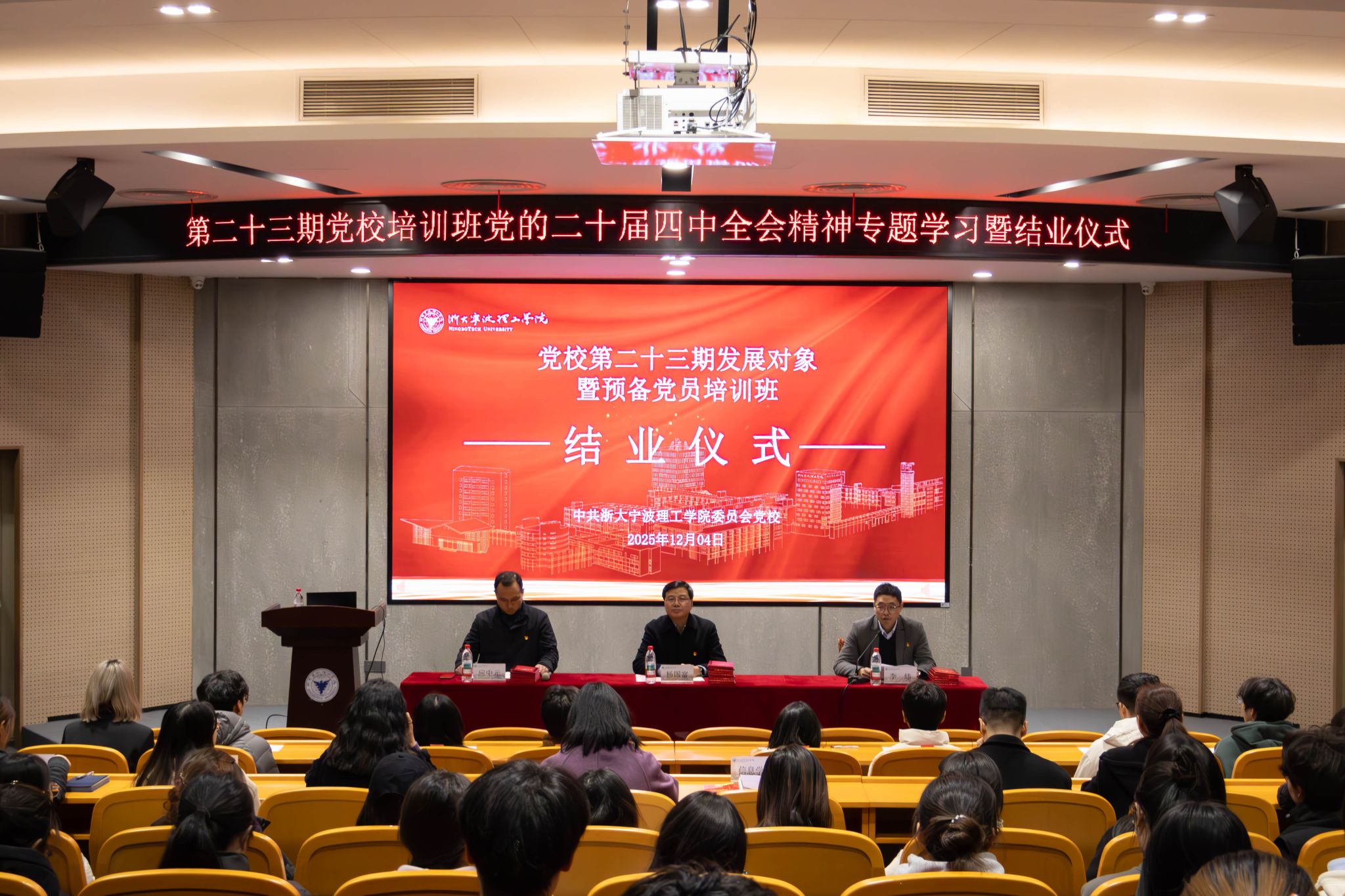为深入学习贯彻党的二十届四中全会精神,进一步加强发展对象和预备党员的理论武装与党性教育,12月4日,学校党校第二十三期发展对象、预备党员培训班党的二十届四中全会精神专题学习暨结业仪式在启新大讲堂举行。学校党委副书记杨国富出席仪式并讲话。组织部(党校)、学生工作部相关负责人及各教学班班主任、全体学员参加。