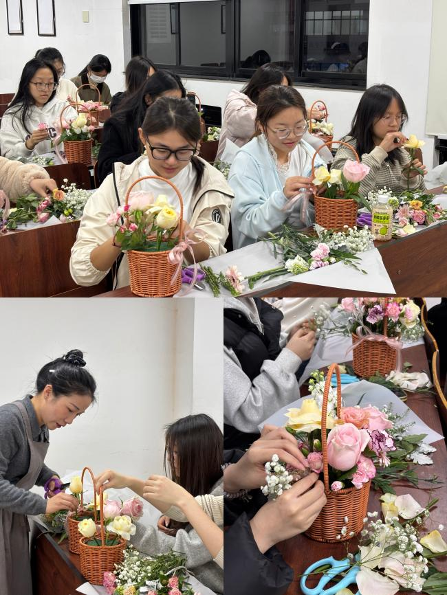 活动现场花香四溢,气氛温馨融洽。在专业花艺师的悉心指导下,同学们充分发挥想象力与创造力,精心挑选各式鲜花绿植,用心构思、巧妙搭配,将平凡的花材转化为一件件独具匠心、承载个人情感的创意插花作品。巧手翻飞间,不仅展现了女大学生们的灵巧与智慧,更在忙碌的学习之余享受了一段放松身心、感受美好的“花漾时光”。
